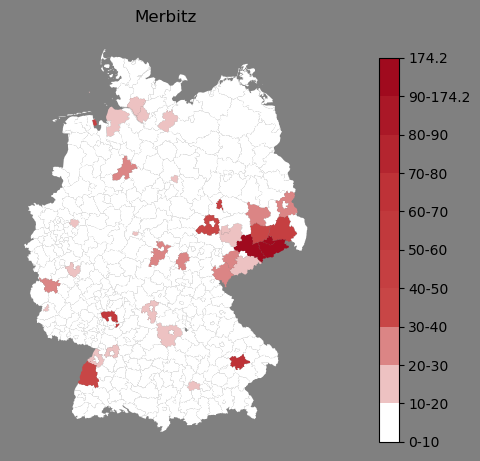Relative Verteilung des Namens Merbitz (1996)Direkt zur Karte Die Farbskala zeigt die Anzahl von "Merbitz" bezogen auf je 1 Million Einträge. |