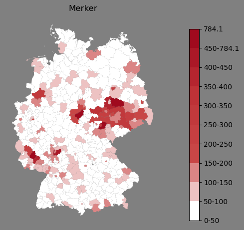 Relative Verteilung des Namens Merker (1996)Direkt zur Karte Die Farbskala zeigt die Anzahl von "Merker" bezogen auf je 1 Million Einträge. |