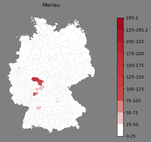 Relative Verteilung des Namens Merlau (1996)Direkt zur Karte Die Farbskala zeigt die Anzahl von "Merlau" bezogen auf je 1 Million Einträge. |