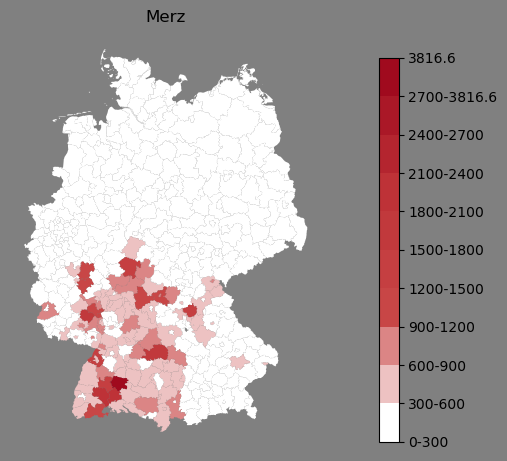 Relative Verteilung des Namens Merz (1996)Direkt zur Karte Die Farbskala zeigt die Anzahl von "Merz" bezogen auf je 1 Million Einträge. |