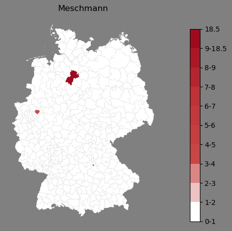 Relative Verteilung des Namens Meschmann (1996)Direkt zur Karte Die Farbskala zeigt die Anzahl von "Meschmann" bezogen auf je 1 Million Einträge. |