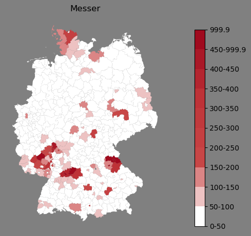 Relative Verteilung des Namens Messer (1996)Direkt zur Karte Die Farbskala zeigt die Anzahl von "Messer" bezogen auf je 1 Million Einträge. |