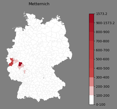 Relative Verteilung des Namens Metternich (1996)Direkt zur Karte Die Farbskala zeigt die Anzahl von "Metternich" bezogen auf je 1 Million Einträge. |