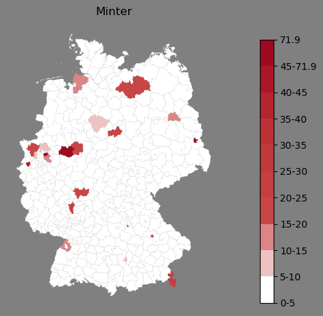 Absolute Verteilung des Namens Minter (1890)Direkt zur Karte Absolute Verteilung des Namens "Minter" um 1890 im damaligen Deutschen Reich Sie können die Karte innerhalb des Fensters zoomen und verschieben. |