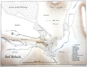 Nur wenige hundert Meter südlich von der Mirbacher Erlöserkapelle entfernt, liegt von Sträuchern und hohen Bäumen überwuchert die verfallende Burgruine Mirbach.