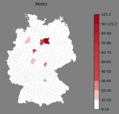Relative Verteilung des Namens Molitz (1996)Direkt zur Karte Die Farbskala zeigt die Anzahl von "Molitz" bezogen auf je 1 Million Einträge. |