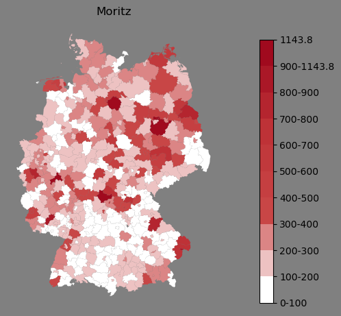 Relative Verteilung des Namens Moritz (1996)Direkt zur Karte Die Farbskala zeigt die Anzahl von "Moritz" bezogen auf je 1 Million Einträge. |