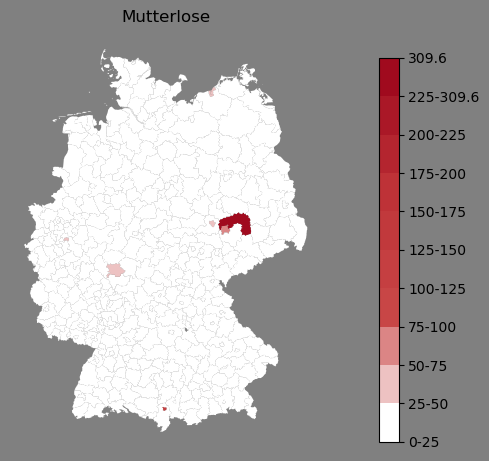 Relative Verteilung des Namens Mutterlose (1996)Direkt zur Karte Die Farbskala zeigt die Anzahl von "Mutterlose" bezogen auf je 1 Million Einträge. |