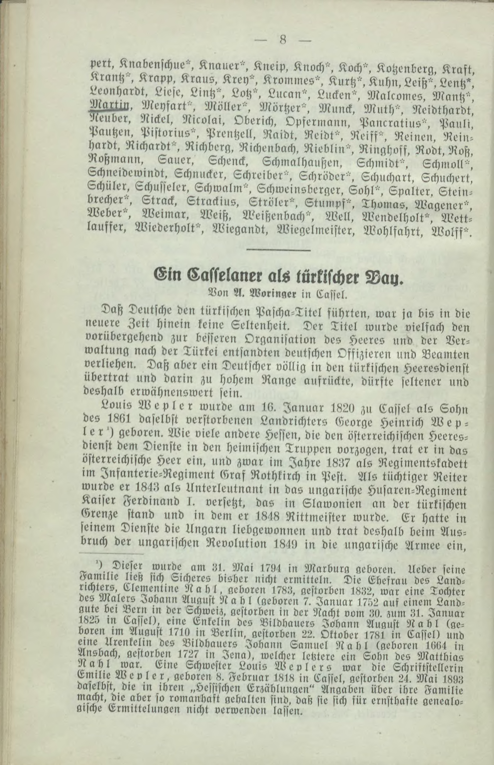Daß Deutsche den türkischen Pascha-Titel führten, war ja bis in die neuere Zeit hinein keine Seltenheit. Der Titel wurde vielfach den vorübergehend zur besseren Organisation des Heeres und der Verwaltung nach der Türkei entsandten deutschen Offizieren und Beamten verliehen. Daß aber ein Deutscher völlig in den türkischen Heeresdienst übertrat und darin zu hohem Range aufrückte, dürfte seltener und deshalb erwähnenswert sein.