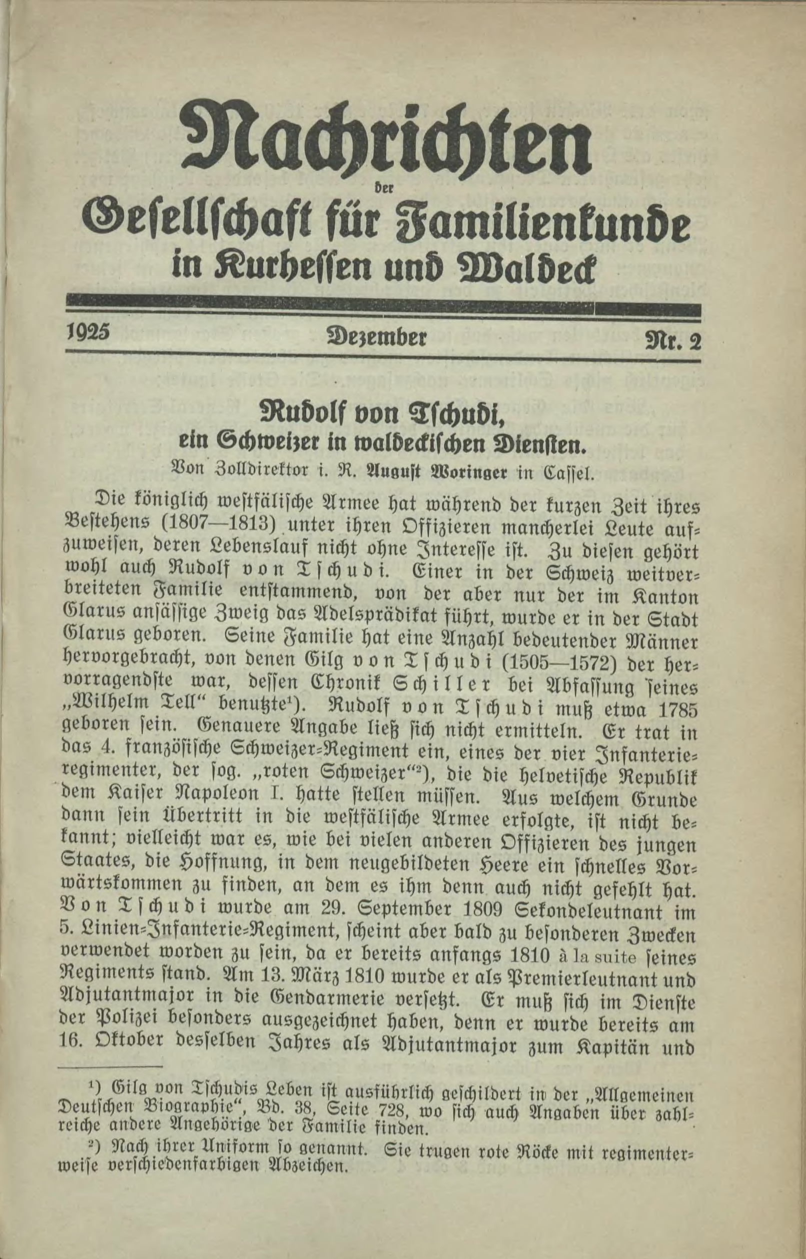 Nachrichten Gesellschaft für Familientunde in Kurhessen und Naldeck 192S Dezember Nr. 2 Rudolf von Tschudi. ein Schweizer in walbeckischen Diensten. Von Zolldirektor i. R. August Worin»« in Cassel. Die königlich westfälische Armee hat wählend der kurzen Zeit ihres Bestehens (1807—1813) unter ihren Offizieren mancherlei Leute auf-zuweisen, deren Lebenslauf nicht ohne Interesse ist. Zu diesen gehört wohl auch Rudolf von Tschudi. Einer in der Schweiz weitver-breiteten Familie entstammend, von der aber nur der im Kanton Glarus ansässige Zweig das Adelsprädikat führt, wurde er in der Stadt Glarus geboren. Seine Familie hat eine Anzahl bedeutender Männer hervorgebracht, von denen Gilg von Tschudi (1505—1572) der her-vorragendste war, dessen Chronik Schiller bei Abfassung seines „Wilhelm Teil" benutzte'). Rudolf von Tschudi mutz etwa 1785 geboren sein. Genauere Angabe ließ sich nicht ermitteln. Er trat in das 4. französische Schweizer-Regiment ein, eines der vier Infanterie-regimenter, der sog. „roten Schweizer"-'), die die helvetische Republik dem Kaiser Napoleon l. hatte stellen müssen. Aus welchem Grunde dann sein Übertritt in die westfälische Armee erfolgte, ist nicht be¬kannt,' vielleicht war es, wie bei vielen anderen Offizieren des jungen Staates, die Hoffnung, in dem neugebildeten Heere ein schnelles Vor¬wärtskommen zu finden, an dem es ihm denn auch nicht gefehlt hat. Von Tschudi wurde am 29. September 1809 Sekondeleutnant im 5. Linien-Infanterie-Regiment, scheint aber bald zu besonderen Zwecken verwendet worden zu sein, da er bereits anfangs 181(1 »I» »uits seines Regiments stand. Am 13. März 1810 wurde er als Premierleutnant und Adjutantmajor in die Gendarmerie versetzt. Er muß sich im Dienste der Polizei besonders ausgezeichnet haben, denn er wurde bereits am 18. Oktober desselben Jahres als Adjutantmajor zum Kapitän und l) Gilg von Tschudis Leben ist ausführlich geschildert in der „Allgemeinen Deutschen Biographie", Vd. 3», Seite 728, wo sich auch Angaben über zahl¬reiche andere Angehörige der Familie finden, -') Nach ihrer Uniform so genannt. Sie trugen rote Röcke mit regimenter-weise verschiedenfarbigen Abzeichen.