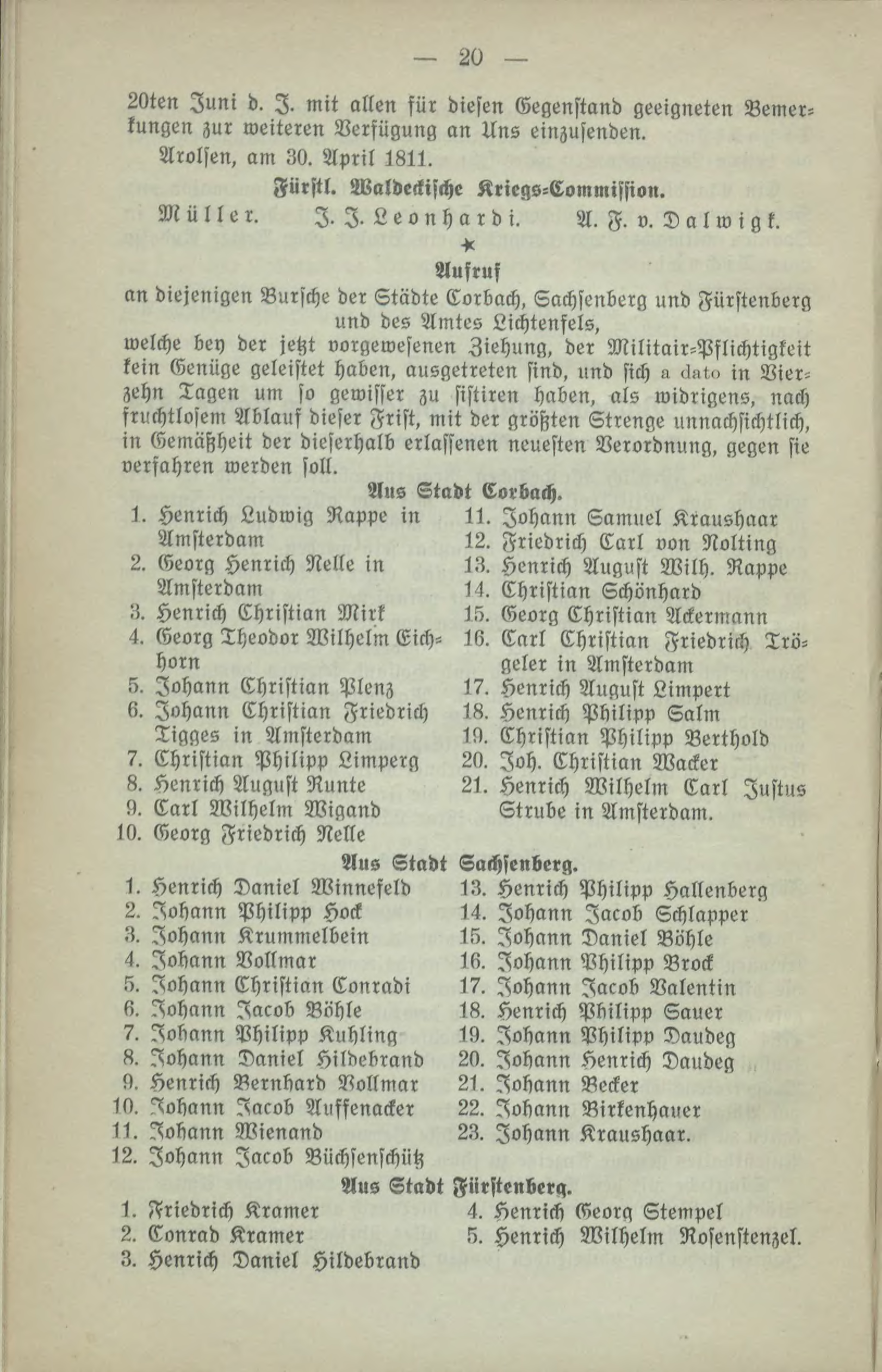 20ten Juni d. I. mit allen für diesen Gegenstand geeigneten Bemer¬kungen zur weiteren Verfügung an Uns einzusenden. Arolsen, am 30. April 1811. Fiirstl. Waldeckische Kriegs-Commission. Müller. I. I. Leonhardi. A. F. v. D al w i g k. Aufruf an diejenigen Bursche der Städte Corbach, Sachsenberg und Füistenbeig und des Amtes Lichtenfels, welche bey dei jetzt volgewesenen Ziehung, der Militair-Pflichtigkeit kein Genüge geleistet haben, ausgetreten sind, und sich n <Il>w in Vier¬zehn Tagen um so gewisser zu sistiren haben, als widrigens, nach fruchtlosem Ablauf dieser Frist, mit der größten Strenge unnachsichtlich, in Gemäßheit der dieserhalb erlassenen neuesten Verordnung, gegen sie verfahren werden soll.