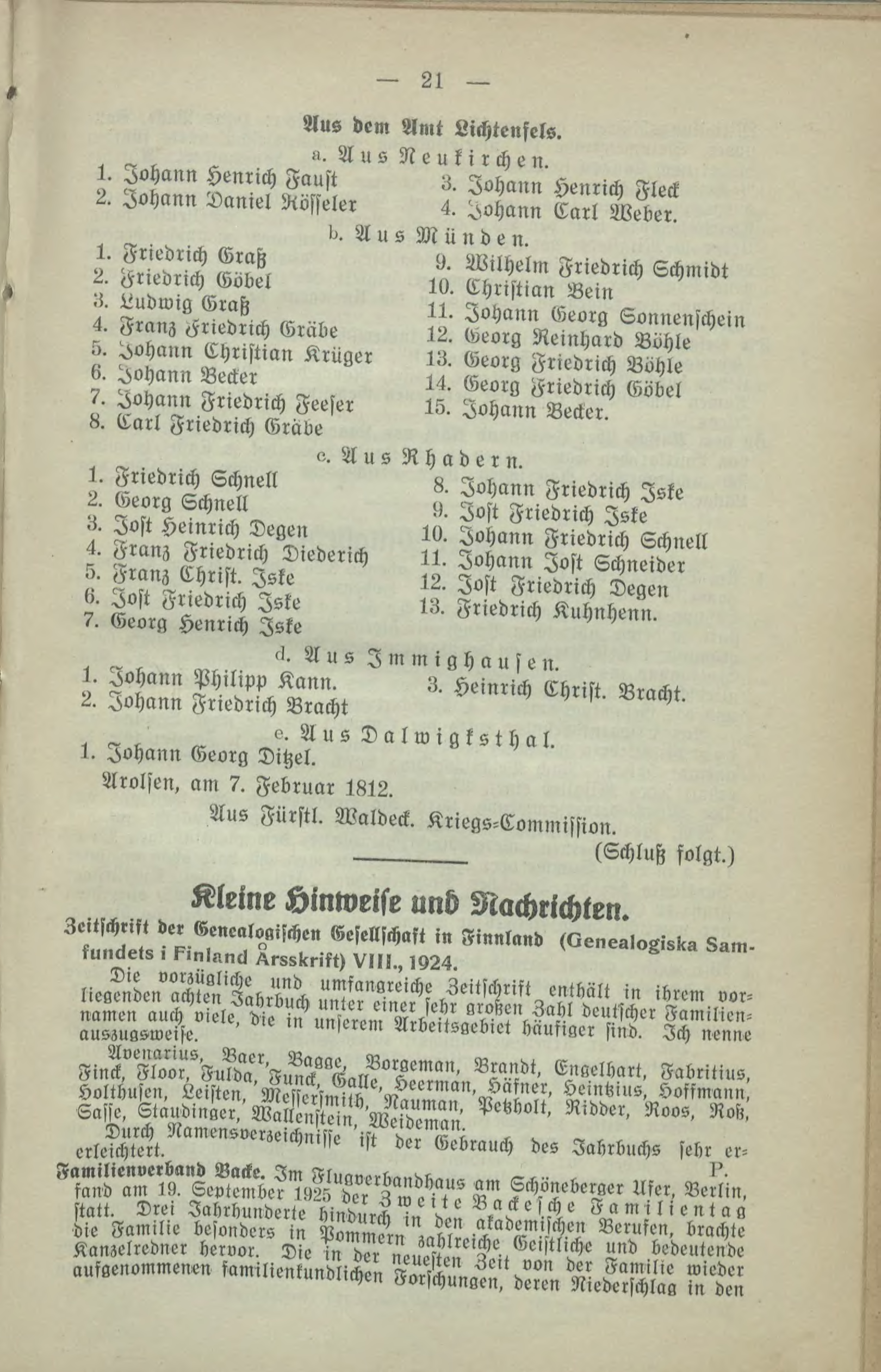 12 14 15. Johann Becker. Friedlich Ercch Friedrich Gobel Ludwig Erllh Franz Friedrich Grabe Johann Christian Krüger Johann Becker Johann Friedlich Feeser Carl Friedrich Grabe «. Aus Rhadern. 8. Johann Friedlich Iske «. Iost Friedrich Iske 1U. Johann Friedrich Schnell 11. Johann Iost Schneider 12. Iost Friedrich Degen 13. Friedrich Kuhnhenn. Friedrich Schnell Georg Schnell Iost Heinrich Degen Franz Friedrich Diederich Franz Christ. Iske Iost Friedrich Iske Georg Henrich Iske s>. Aus I m m i g h a u s e n. Johann Philipp Kann. 3. Heinrich Christ. Bracht. Johann Friedrich Bracht <. Aus Dalmigksthal. 1. Johann Georg Ditzel. Arolsen, am?. Februar 1812. Aus Fürstl. Waldeck. Kriegs-Commission. (Schluß folgt.) Kleine Hinweise und Nachrichten. Zeitschrift der Genealoaischen Gesellschaft in Finnland <Uene«<<,3,'5!c« 8am-funllet» > finlnnc! ^rzzkritt) VlII., 1924. Die vorzügliche und umfangreiche Zeitschrift enthält in ihrem vor-liegenden achten Jahrbuch unter einer sehr große» Zahl deutscher Familien¬namen auch viele, die in unserem Arbeitsgebiet häufiger sind. Ich nenne auszugsweise. AoenariuL, Vaei, Vaggc, Vorgcman, Brandt, Ennclbart, Fabritius, Finck, Flooi, Fulda, Funck, Valle, bcerman, Hafner, HeintziuL, Öoffmann, Holthusen, Leisten, Messeismith, Nauman. Peizholt, Ridder. Roos. Roh. Sasse, Staudinger, Wallenstein, Weidcman. Durch Namensuerzeichnisse ist der Gebrauch des Jahrbuchs sehr er- crleichtort, ?. Familienverband Backe. Im Fluguerbandhaus am Schöneberger Ufer, Berlin, fand am 1», September 1 »25 der Z m e i t c V acke sch e Fa m i l i cnt a g statt. Drei Iahrhunderie hindurch in den akademischen Berufen, brachte die Familie be,onders in Pommern zahlreiche Geistliche und bedeutende Kanzclredner hervor. Die in der neuesten Zeit von der Familie wieder aufgenommenen familienkundlichen Forschungen, deren Niederschlag in den