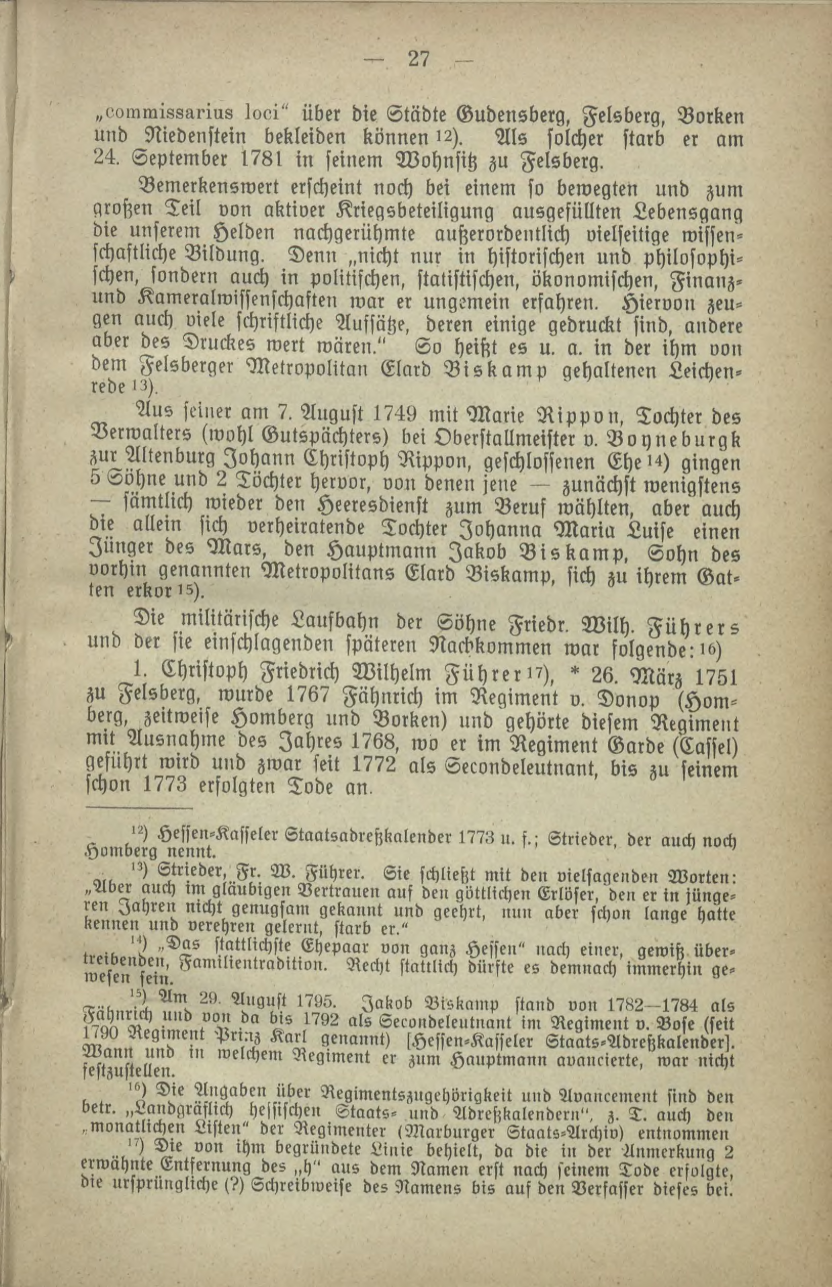 „(>ammi88Ä!'iu8 luni" über die Städte Gudensberg, Felsberg, Borken und Niedenstein bekleiden können '2). Als solcher starb er am 24, September 1?8l in seinem Wohnsitz zu Felsberg, Bemerkenswert erscheint noch bei einem so bewegten und zum großen Teil von aktiver Kriegsbeteiligung ausgefüllten Lebensgang die unserem Helden nachgerühmte außerordentlich vielseitige wissen¬schaftliche Bildung, Denn „nicht nur in historischen und philosophi¬schen, sondern auch in politischen, stalistischen, ökonomischen, Finanz» und Kameralwissenschaften war er ungemein erfahren. Hiervon zeu¬gen auch viele schriftliche Aufsätze, deren einige gedruckt sind, andere aber des Druckes wert wären," So heißt es u. a. in der ihm von dem Felsberger Metropolitan Elard Bis Kamp gehaltenen Leichen¬rede^), Aus seiner am 7. August 1749 mit Marie Rippon, Tochter des Verwalters (wohl Gutspächters) bei Oberstallmeister v, Bonne burgk zur Altenburg Johann Christoph Rippon, geschlossenen Ehe>4) gingen 5 Söhne und 2 Töchter hervor, von denen jene ^ zunächst wenigstens — sämtlich wieder den Heeresdienst zum Beruf wählten, aber auch die allein sich verheiratende Tochter Johanna Maria Luise einen Jünger des Mars, den Hauptmann Jakob Bis Kamp, Sohn des uoihin genannten Mettopolitans Elaid Biskamp, sich zu ihrem Gat» ten erkor'5). Die militärische Laufbahn der Söhne Friedr, Wilh. Führers und der sie einschlagenden späteren Nachkommen war folgende: ><>) 1. Christoph Friedrich Wilhelm Führer'?), * 26. März 1751 zu Felsberg, wurde 1767 Fähnrich im Regiment u, Donop (Hom-berg, zeitweise Homberg und Borken) und gehörte diesem Regiment mit Ausnahme des Jahres 1768, wo er im Regiment Garde (Cassel) geführt wird und zwar seit 1772 als Secondeleutnant, bis zu feinem schon 1773 erfolgten Tode an. >2) Hessen-Kasseler Staatsadreßkalender 1778 n. f.; Strieder, der auch noch Homberg nennt. ") Strieder, Fr. W. Führer. Sie schließt mit den vielsagenden Worten: „Aber auch im gläubigen Vertrauen auf den göttlichen Erlöser, den er in jünge¬ren Jahren nicht genugsam gekannt und geehrt, nun aber schon lange hatte kennen und verehren gelernt, starb er," ") „Das stattlichste Ehepaar von ganz Hessen" nach einer, gewiß über» treibenden, Familienlradition. Recht stattlich dürfte es demnach immerhin ge-wesen sein. "> Am 29, August 1795. Jakob Biskamp stand von 1782—1784 als Fähnrich und non da bis 1792 als Secundeleutnant im Regiment v. Vose (seit 1790 Regiment Priuz Karl genannt» IHessen-Kasseler Staats.Adrehkalenderi. Wann und in welchem Regiment er zum Hauptmann avancierte, war nicht festzustellen. >6) Die Angaben über Regimentszuaehörigkeit und Avancement sind den betr. „Landaiäflich hessischen Staats« und Adreßkalendern", z. T. auch den .monatlichen Listen" der Regimenter <Marburger Staats-Archiv) entnommen >') Die von ihm begründete Linie behielt, da die in der Anmerkung 2 erwähnte Entfernung de« „h" aus dem Namen erst nach seinem Tode erfolgte, die ursprüngliche <?) Schreibweise des Namens bis auf den Verfasser dieses bei.