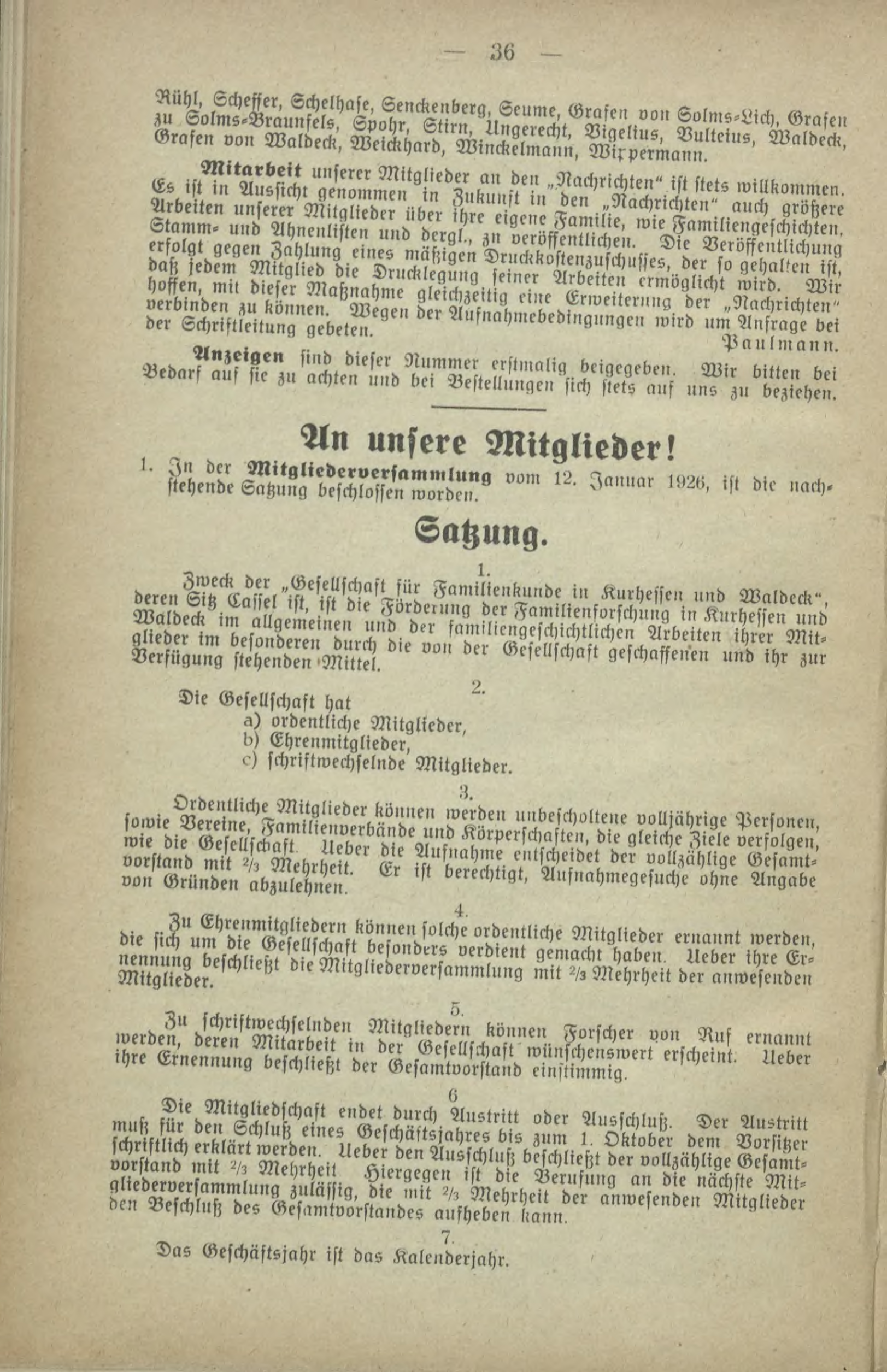 Aühl, Scheffer, Echelhase, Senckenberg, Seume, Grase» von Solms-Lich, Grase» zu Solms'Braunfel«, Spuhr, Stirn, Ungerecht, Vigelius, Vultciu«, Wnldcck, Grafen von Waldeck, Weickhard, Minckelmann, Mixpermann, Mitarbeit unseier Mitglieder an den „Nachrichten" ist Nets willkommen, Es ist in Aussicht genommen in Zukunft in den „Nachrichten" auch größere Arbeiten unserer Mitglieder über ihre eigene Familie, wie Familiengeschichten, Stamm« und Ahnenlisten und dergl,, z» veröffentlichen. Die Veröffentlichung erfolgt gegen Zahlung eines mäßigen Druckkostenzuschufses, der so gehauen ist, dafz jedem Mitglied die Drucklegung seiner Arbeiten ermöglicht wird. Wir hoffen, mi! dieser Maßnahme gleichzeitig eine Erweiterung der „Nachrichten" verbinden zu können. Wegen der Aufnahmebedingnngcu wird um Anfrage bei der Schriftleitilng gebeten. Paul mann. Anzeigen sind dieser Nummer erflnialig beigegeben. Wir bitten bei Bedarf auf sie zu achten und bei Bestellungen fich stets ans nn? zu beziehe». An unsere Mitglieder! l. In der Mitgliederversammlung vom l^. Iannnr I!»A>, ist die »ach« stehende Satzung beschlossen worden. Satzung. i, Zweck der „Gesellschaft für Familienku»dc in Kurhefsen und Waldeck", deren Sitz Cafsel ist, ist die Fürdeinng der Familienfurschnng i» Knrhessen und Waldeck im allgemeinen und der familicngeschichtlichen Arbeiten ihrer Mit» glieder im besonderen durch die uuu der Gesellschaft geschaffenen und ihr zur Verfügung stehenden Mittel, Die Gesellschaft hat a) ordentliche Mitglieder, I>> Ehrenmitglieder, ^) schriftwechselude Mitglieder.