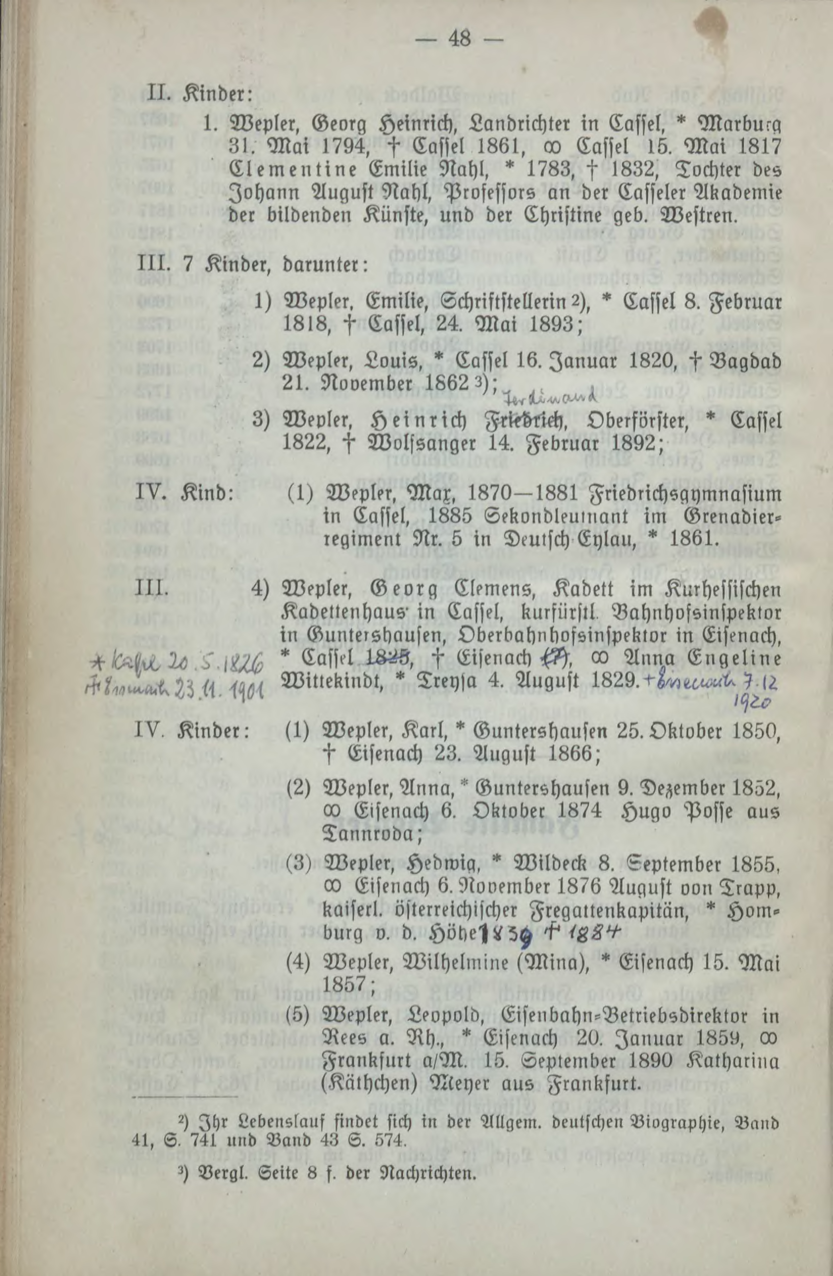 II. Kinder: 1. Wepler, Georg Heinrich, Landrichter in Cassel, * Marburg 31. Mai 1794, f Cassel 1861. w Cassel 15, Mai 1817 Clementine Emilie Nah!, * 1783. f 1832, Tochter des Johann August Nahl, Professors an der Casseler Akademie der bildenden Künste, und der Christine geb. Wesiren. III. 7 Kinder, darunter: 1) Wepler. Emilie, Schriftstellerin 2), * Cassel 8. Februar 1818. f Cassel, 24. Mai 1893: 2) Wepler, Louis. * Cassel 16. Januar 1820, -f- Bagdad 21. Nuoember 1862 3)^ 3) Wevler. Heinrich Frl^lch. Oberförster, * Cassel 1822, -f- Wolssanger 14. Februar 1892; IV. Kind: (1) Wepler. Max. 1870—1881 Friedrichsgymnasium in Cassel, 1885 Sekondleuinant im Grenadier« icgiment Nr. 5 in Deuisch Eylau, * 1861. III, 4) Wepler, Georg Clemens, Kadett im Kurhessischen Kadeüenhaus' in Cassel, kurfiirfll, Vahnhofsinspeklor in GunlelShausen, Oberbahi'hoföinspeklor in Eisenach,