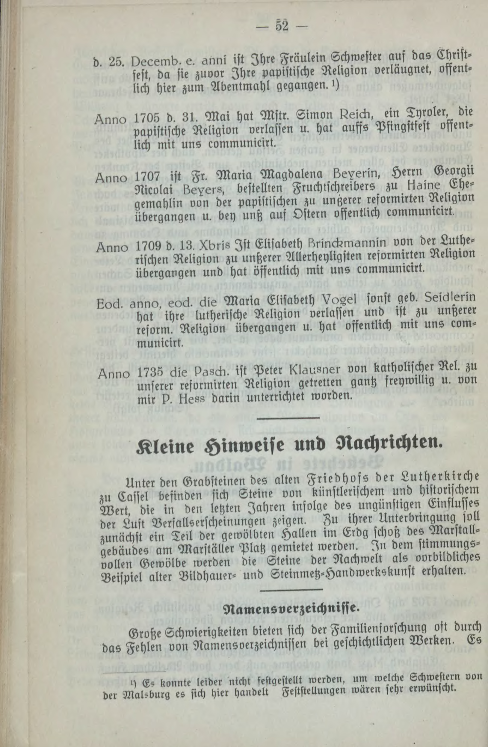 d. 25. vecemb. e. gnni ist Ihre Fräulein Schwester auf das Christ' fest, da sie zuvor Ihre papistische Religion verläugnet, offent» lich hier zum Atientmahl gegangen. >) Anno 1705 d, 31. Mai hat Mstr. Simon Deick, ein Tyroler, die papistische Religion verlassen u. hat auffs Psingstfeft offent» lich mit uns communicirt. Anno 1707 ist Fr. Maria Magdalena Lederin, Herrn Georgii Nicolai bever», bestellten Fruchlschreibers zu t^aine Ehe-gemahlin von der papiitischen zn ungerer reformirten Neligion Übergängen u. ben untz auf Ostern öffentlich communicirt. Anno 1709 d. 13, Xbrw Ist Elisabeth krinckmgnnin von der Luthe» rischen Religion zu unherer Allerheyligsten reformirten Religion Übergängen und hat öffentlich mit uns communicirt. . snno, eocl. 6ie Maria Elisabeth VoZel sonst geb. hat ihre lutherische Religion verlassen und ist zu untzeiei resorm. Religion Übergängen u. hat öffentlich mit uns com» municirt. Anno 1735 6ie paZck. ist Peter Klausner von katholischer Rel. zu unser« reformirten Religion getreuen gantz freywillig u. von mir P. Ne8n darin unterrichtet worden. Kleine Hinweise und Nachrichten. Unter den Grabsteinen des alten Friedhofs der Lutherkirche zu Cafsel befinden sich Steine von künstlerischem und historischem Wert, die in den letzten Jahren infolge des ungünstigen Einflusses der Luft Verfalltzerscheimingen zeigen, ssu ihrer Unterbringung soll zunächst ein Teil der gewölbten Hallen im Erdg schoß des Marstall» gebäudes am Marstaller Platz gemietet werden. In dem stimmungs-vollen Gewölbe weiden die Steine der Nachwelt als oorbildliches Beispiel alter Bildhauer- und Tteinmetz'Handwerkskunst erhalten. Namensverzeichnisse. Große Schwierigkeiten bieten sich der Familienforschung oft durch das Fehlen von Namenverzeichnissen bei geschichtlichen Werken. Es >) E5 krninte leider nicht festgestellt werden, um welche Schwestern uu» der Marburg es sich hier handelt Feststellungen wären sehr erwünscht.