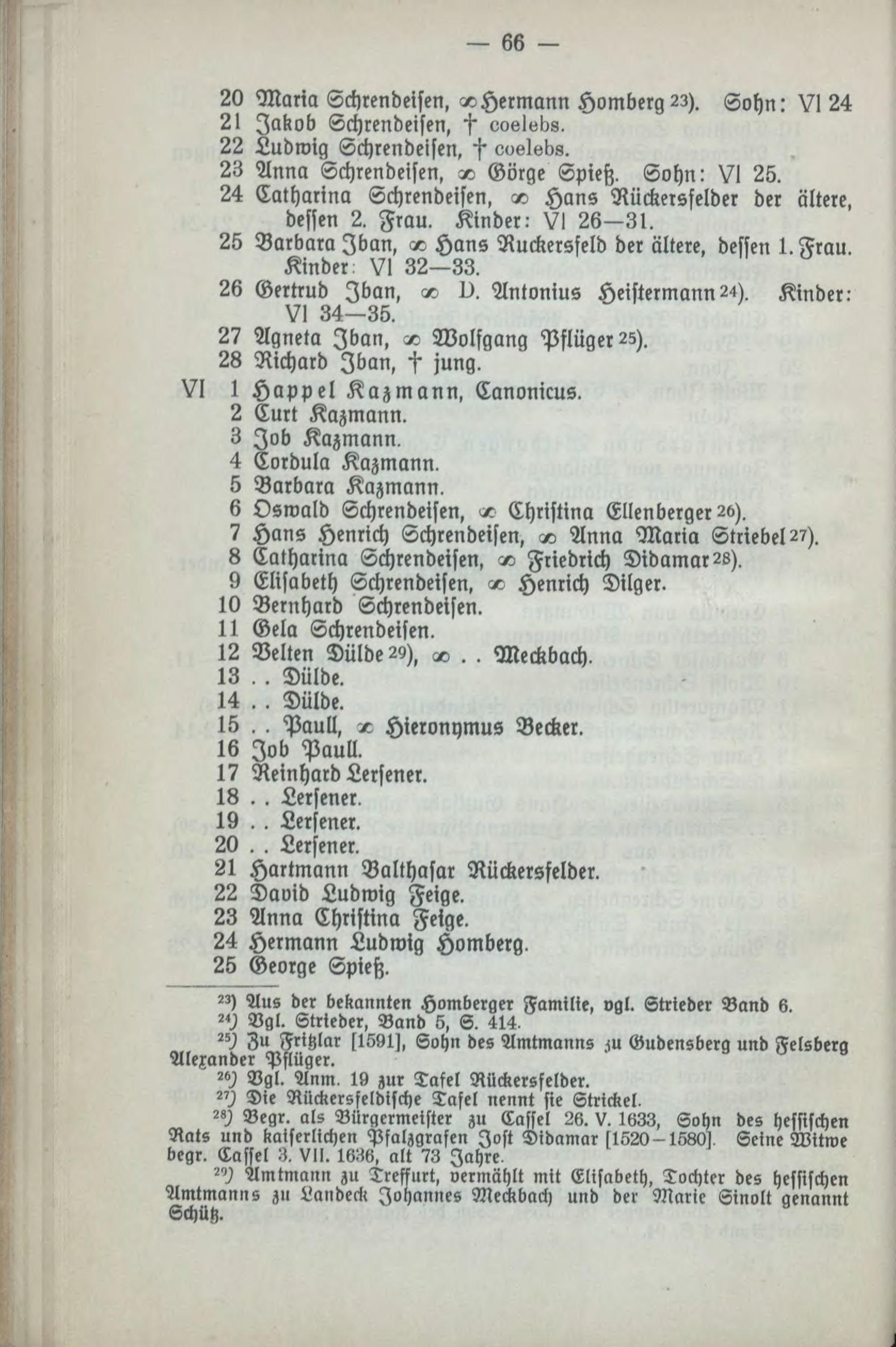 20 Maria Schlendeisen, «? Hermann Homberg 23). Sohn: VI 24 2! Jakob Tchrendeisen, I' ooslubg, 22 Ludwig Schiendeisen, ^ «<ie!«li8. 23 Anna Schlendeisen, n Görge Spieß, Sohn: VI 25. 24 Cathaiinll Schlendeisen, n> Hans Rückeisfeldel dei ältne, dessen 2. Flau. Kinder: V! 26-31. 25 Barbara Iban, c« Hans Ruckersfeld der ältere, dessen 1. Frau. Kinder VI 32—33. 26 Gertrud Iban, n O. Antonius Heistermann24). Kinder.- VI 34—35. 2? Agneta Iban. -O Wolfgang Pflüger25). 28 Richard Iban, -st jung. VI 1 Happel Kazmann, Canonicus. 2 Curt Kazmann. 3 Job Kazmann, 4 Cordula Kazmann. 5 Barbara Kazmann, 6 Oswald Schrendeisen, ^ Christina Ellen beiger 2h). 7 Hans Henrich Schrendeisen, n Anna Maria Strieder?). 8 Cathlllina Schlendeisen, c« Friedrich Didamar2L). 9 Elisabeth Schlendeisen, n Henrich Dilger. 1l) Bernhard Schlendeisen.