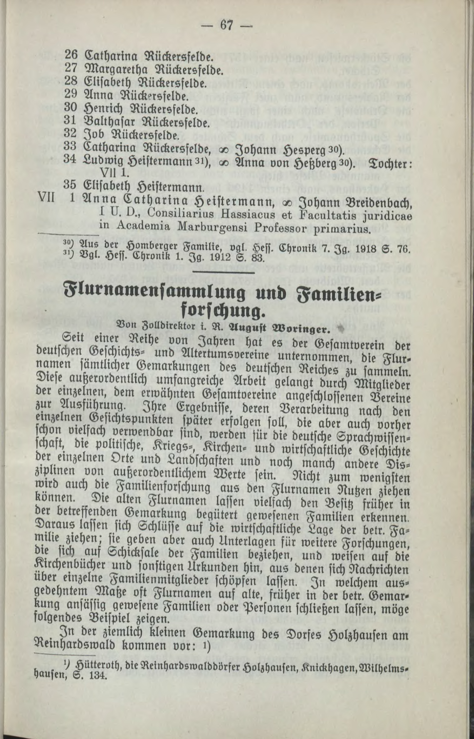 Flurnamenfammlung und Familien-forschung. Von Zulloirektoi i. R. August Woringer. Seit einer Reihe von Jahren hat es der Gesamtoerein der deutschen Geschichts- und Altertumsoereine unternommen, die Flur« namen sämtlicher Gemarkungen des deutschen Reiches zu sammeln. Diese außerordentlich umfangreiche Arbeit gelangt durch Mitglieder der einzelnen, dem erwähnten Gesamtoereine angeschlossenen Vereine zur Ausführung. Ihre Ergebnisse, deren Verarbeitung nach den einzelnen Gesichtspunkten später erfolgen soll, die aber auch vorher schon vielfach verwendbar sind, weiden für die deutsche Sprachwissen« schaft, die politische, Kriegs-, Kirchen« und wirtschaftliche Geschichte der einzelnen Orte und Landschaften und noch manch andere Dis¬ziplinen von außerordentlichem Werte sein. Nicht zum wenigsten wird auch die Familienforschung aus den Flurnamen Nutzen ziehen können. Die alten Flurnamen lassen vielfach den Besitz früher in der betreffenden Gemarkung begütert gewesenen Familien erkennen. Daraus lassen sich Schlüsse auf die wirtschaftliche Lage der bell. Fa¬milie ziehen^ sie geben aber auch Unterlagen für weitere Forschungen, die sich auf Schicksale der Familien beziehen, und weisen auf die Kirchenbücher und sonstigen Urkunden hin, aus denen sich Nachrichten über einzelne Familienmitglieder schöpfen lassen. In welchem aus» gedehntem Maße oft Flurnamen auf alte, früher in der betr. Gemar» kung ansässig gewesene Familien oder Personen schließen lassen, möge folgendes Beispiel zeigen. In der ziemlich kleinen Gemarkung des Dorfes Oolzhausen am Neinhardswald kommen vor: >) >) Hütteruth, die Reinhardswalddürfei Hlllzhausen, Knickhllgen,Wilhelms-Hausen, L. 134.