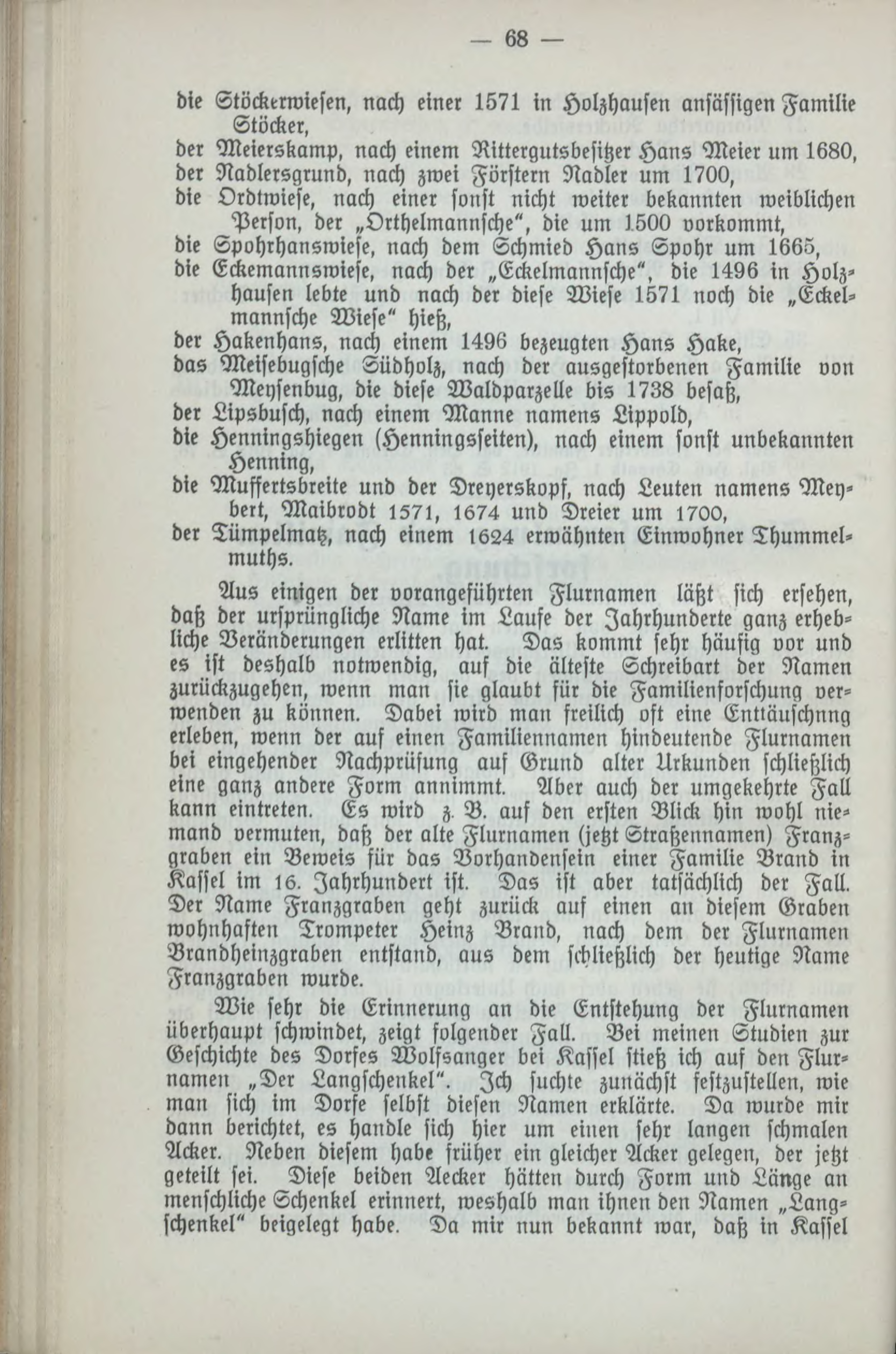 die Stöckelwiesen, nach einer 1571 in Holzhausen ansässigen Familie Stöckei, der Meierskamp, nach einem Rittergutsbesitzer Hans Meier um 1680, der Nadleisgiund, nach zwei Förstern Nadler um 1700, die Ordtwiese, nach einer sonst nicht weiter bekannten weiblichen Person, der „Orthelmannsche", die um 1500 vorkommt, die Spohrhanswiese, nach dem Schmied Hans Spohr um 1665, die Eckemannswiese, nach der „Eckelmannsche", die 1496 in Holz» Hausen lebte und nach der diese Wiese 1571 noch die „Eckel- mannsche Wiese" hieß, der Hakenhans, nach einem 1496 bezeugten Hans Hake, das Meisebugsche Tüdholz, nach der ausgestorbenen Familie von Mensenbug, die diese Waldparzelle bis 1738 besaß, der Lipsbusch, nach einem Manne namens Lippold, die Henningshiegen sHenningsseiten), nach einem sonst unbekannten Henning, die Muffertsbreite und der Dreyerskopf, nach Leuten namens Men» beit, Maibrodt 1571, 1674 und Dreier um 1700, der Tümpelmatz, nach einem 1624 erwähnten Einwohner Thummel» muths. Aus einigen der vorangeführten Flurnamen läßt sich ersehen, daß der ursprüngliche Name im Laufe der Jahrhunderte ganz erheb-liche Veränderungen erlitten hat. Das kommt sehr häufig vor und es ist deshalb notwendig, auf die älteste Schreibart der Namen zurückzugehen, wenn man sie glaubt für die Familienforschung ver-wenden zu können. Dabei wird man freilich oft eine Enttäuschnng erleben, wenn der auf einen Familiennamen hindeutende Flurnamen bei eingehender Nachprüfung auf Grund alter Urkunden schließlich eine ganz andere Form annimmt. Aber auch der umgekehrte Fall kann eintreten. Es wird z B, auf den ersten Blick hin wohl nie¬mand vermuten, daß der alte Flurnamen (jetzt Straßennamen) Franz-graben ein Beweis für das Vorhandensein einer Familie Brand in Kassel im 16, Jahrhundert ist. Das ist aber tatsächlich der Fall. Der Name Franzgraben geht zurück auf einen au diesem Graben wohnhaften Trompeter Heinz Brand, nach dem der Flurnamen Brandheinzgraoen entstand, aus dem schließlich der heutige Name Franzgraben wurde. Wie sehr die Erinnerung an die Entstehung der Flurnamen überhaupt schwindet, zeigt folgender Fall, Bei meinen Studien zur Geschichte des Dorfes Wolfsanger bei Kassel stieß ich auf den Flur-namen „Der Langschenkel". Ich suchte zunächst festzustellen, wie man sich im Dorfe selbst diesen Namen erklärte. Da wurde mir dann berichtet, es handle sich hier um einen sehr langen schmalen Acker, Neben diesem habe früher ein gleicher Acker gelegen, der jetzt geteilt fei. Diese beiden Aecker hätten durch Form und Länge an menschliche Schenkel erinnert, weshalb man ihnen den Namen „Lang-schenkel" beigelegt habe. Da mir nun bekannt war, daß in Kassel