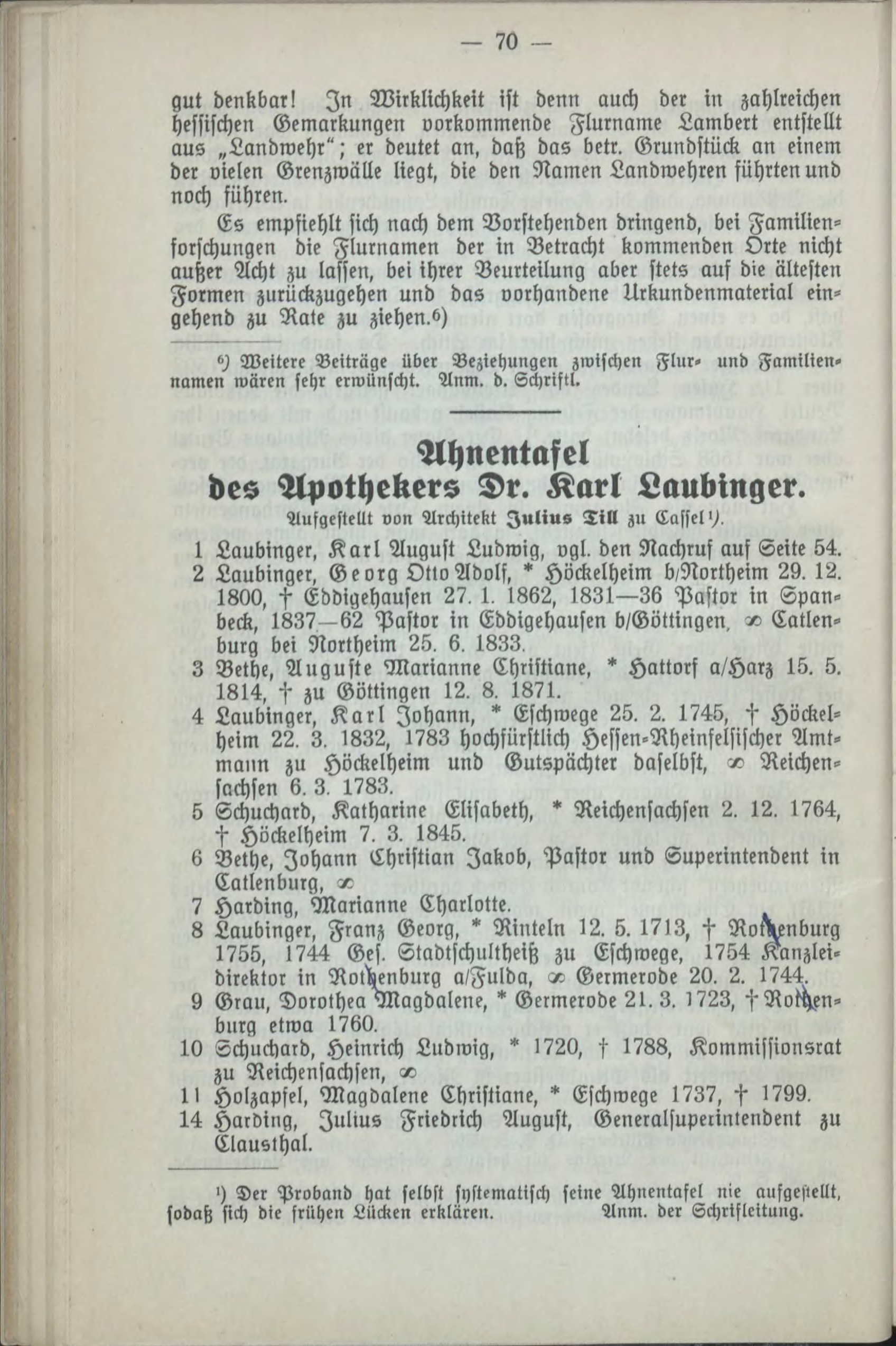 gut denkbar! In Wirklichkeit ist denn auch der in zahlreichen hessischen Gemarkungen vorkommende Flurname Lambert entstellt aus „Landwehr"; er deutet an, daß das betr. Grundstück an einem der vielen Grenzwä'lle liegt, die den Namen Landwehren fühlten und noch führen. Es empfiehlt sich nach dem Vorstehenden dringend, bei Familien-forschungen die Flurnamen der in Betracht kommenden Orte nicht außer Acht zu lassen, bei ihrer Beurteilung aber stets auf die ältesten Formen zurückzugehen und das vorhandene Urkundenmaterial ein¬gehend zu Rate zu ziehend) °) Weitere Veitläge über Beziehungen zwischen Flur» und Familien« namen wären sehr erwünscht. Anm. d. Tchriftl. Ahnentafel des Apothekers Dr. Karl Laubwger. Aufgestellt von Architekt Julius Till zu Hassel >/ 1 Laubwger, Karl August Ludwig, vgl. den Nachruf auf Seite 54. 2 Laubinger. Georg OtloAdolf, *' Höckelheim b/Northeim 29. 12. 1800, f Eddigehausen 27, 1, 1862. 1831—36 Pastor in Span« beck, 1837 ^62 Pastor in Eddigehausen b/Göttingen ^ Catlen» bürg bei Northeim 25, 6, 1833, 3 Bethe, Auguste Marianne Christiane, * Hattorf a/Harz 15. 5. 1814, 1' zu Göttingen 12. 8. 1871. 4 Laubinger. Karl Johann, * Eschmege 25. 2. 1745, f Höckel- heim 22, 3, 1832. 1783 hochfürstlich Hessen-Nheinfelsischer Amt¬ mann zu Höckelheim und Gutspächter daselbst, n Reichen¬ sachsen 6, 3, 1783. 5 Schuchard. Katharine Elisabeth. * Neichensachsen 2. 12. 1764, 1- Höckelheim 7. 3. 1845. 6 Vethe, Johann Christian Jakob, Pastor und Superintendent in Catlenbmg, ^ 7 Harding, Marianne Charlotte. 8 Laubinger. Franz Georg. * Rütteln 12. 5. 1713, f Rotenburg 1755, 1744 Ges. Stadtschultheitz zu Eschwege, 1754 Kanzlei» direktor in Rothenburg a/Fulda, n Geimerode 20. 2. 1744. 9 Giau, Dorothea Magdalene, * Germerode 21. 3. 1723, f Roten¬ burg etwa 1760. 10 Schuchaid, Heiniich Ludwig, * 1720, f 1788, Kommissionsrat zu Neichensachsen, c« 1! Holzapfel. Magoalene Christiane, * Eschwege 1737, f 1799, 14 Haiding, Julius Friedrich August, Generalsupeiinlendent zu Clausthal. ') Der Pruband hat selbst systematisch seine Ahnentafel nie aufgestellt, sodaß sich die frühen Lücken erkläre». Anm. der Schrifleituilg.