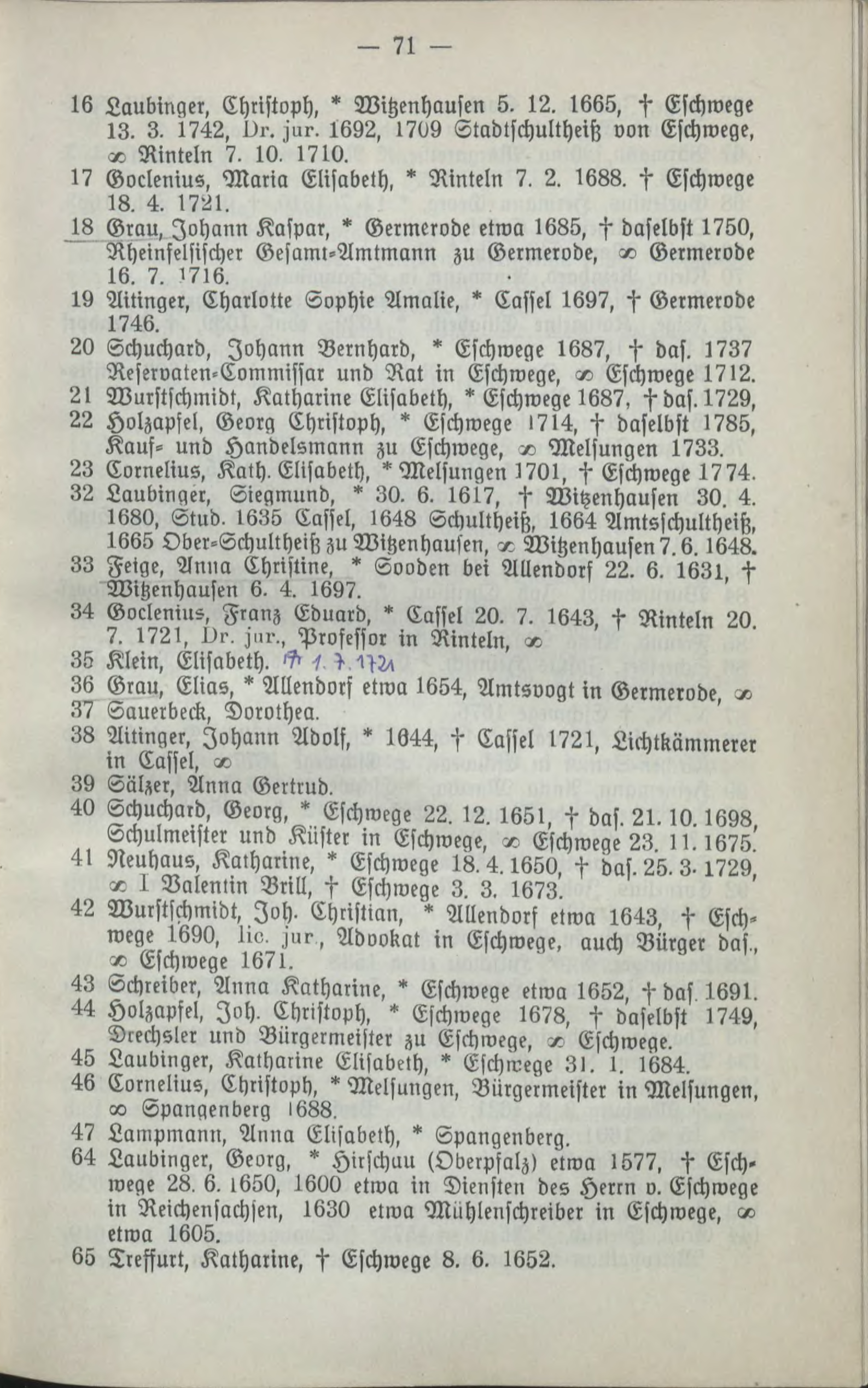 23 Cornelius. Kath, Elisabeth. * Weisungen 1701. f Eschwege 1774,