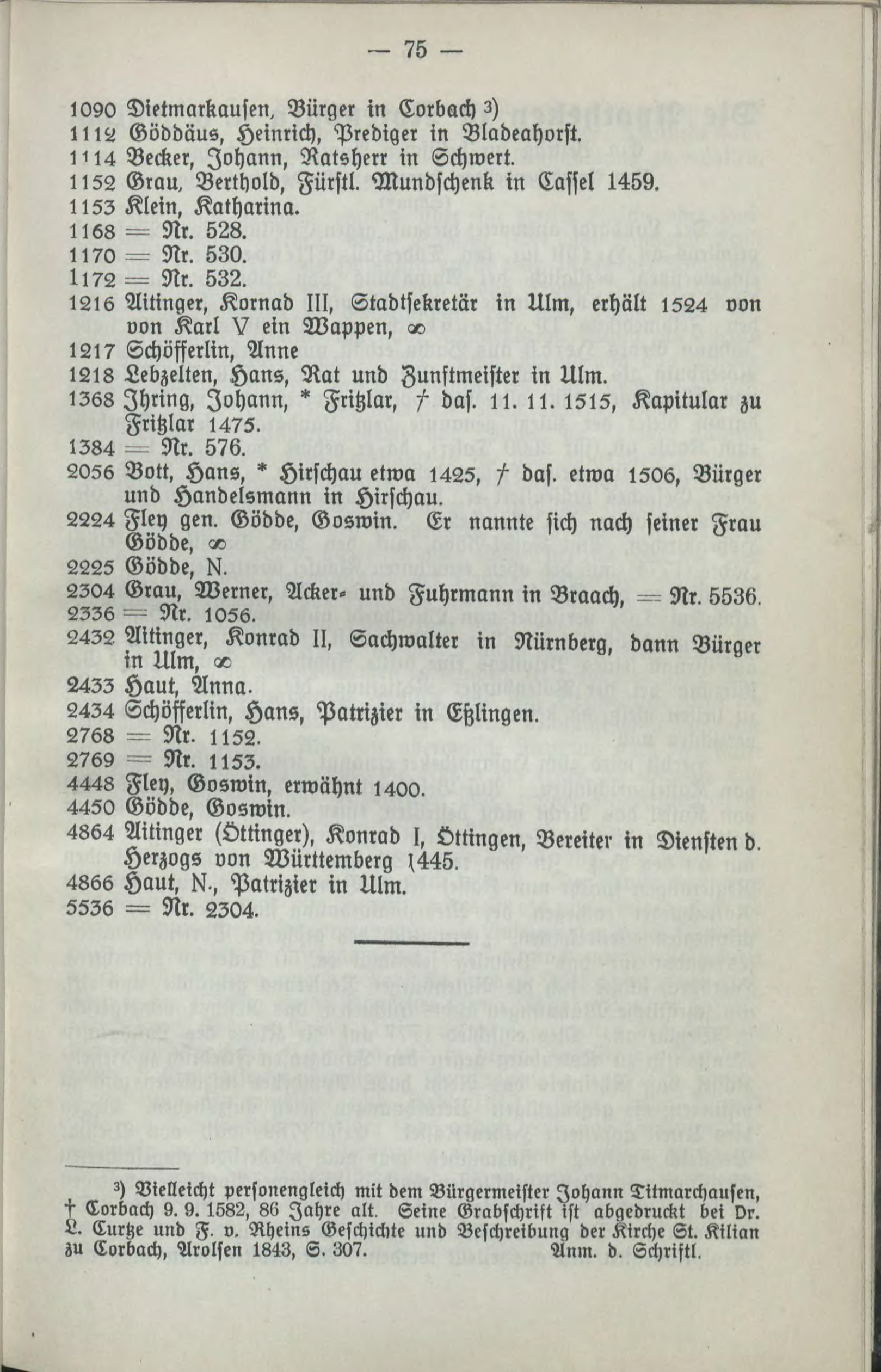2768 -- Nr. 1152. 2769 ^ Nr. 1153. 4448 Fley, Goswin, erwähnt 1400. 4450 Gödde, Goswin. 4864 Aitinger (Öttinger). Komad I, Öttingen, Bereiter in Diensten d. Herzogs von Württemberg 1,445. 4866 Haut, «., Patrizier in Ulm. 5536 ^ Nr. 2304. 3) Vielleicht personengleich mit dem Bürgermeister Johann Titmaichaufen, -f- Toibach 9. 9. 1582, 86 Jahre alt. Seine Grabschiift ist abgedruckt bei Dr. L. Curtze und F, u. Rheins Geschichte und Beschreibung der Kirche St. Kilian zu Corbach, Arolsen 1843, S. 307. Anm. d. Schliftl,