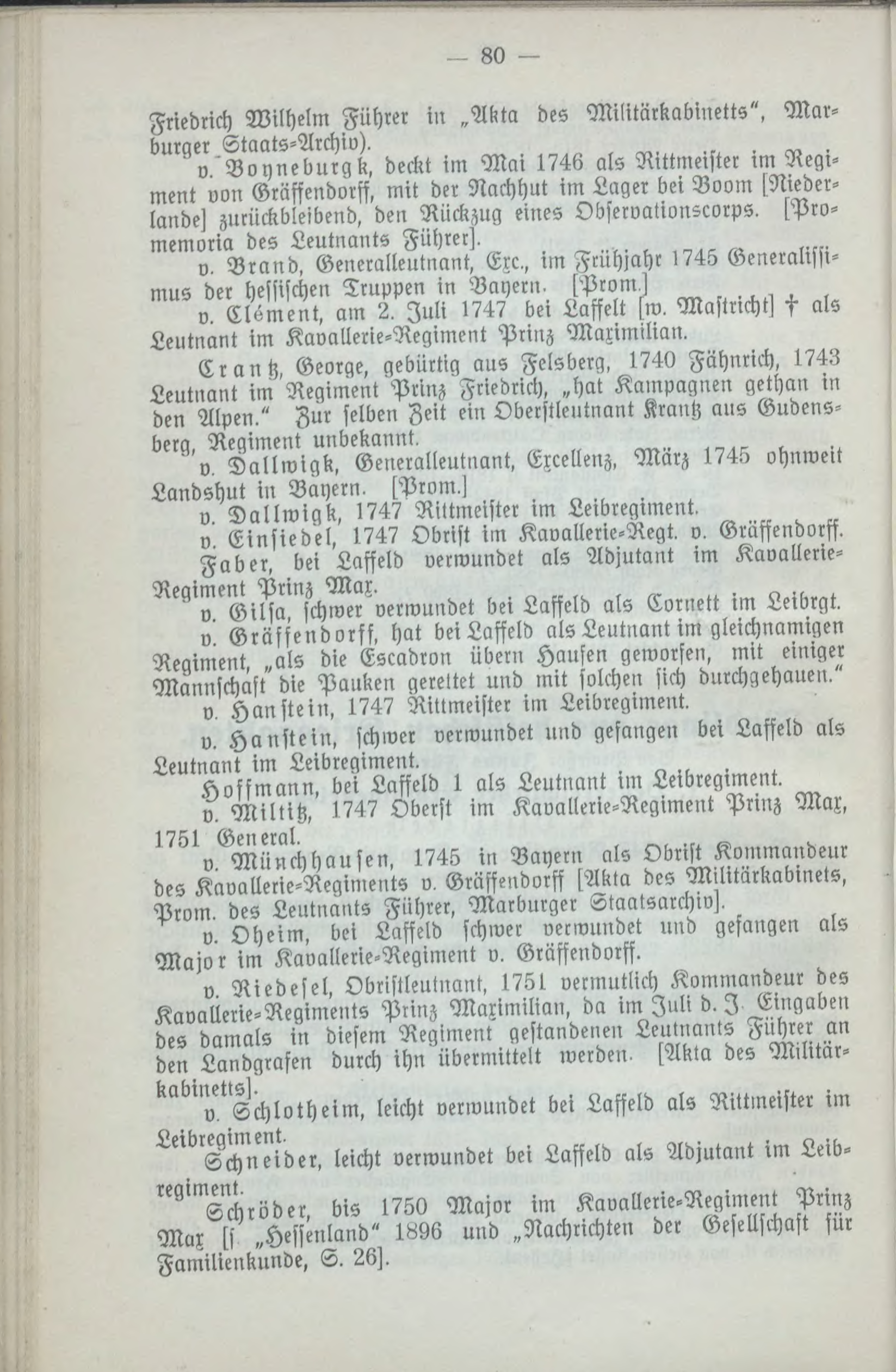 Friedrich Wilhelm Führer in „Akta des Militärkabinetts", Mar-burgerStaats-Archio). n, Voyneburgk, deckt im Mai 1746 als Rittmeister im Regi¬ment von Gräffendorff, mit der Nachhut im Lager bei Boom IMeder-landej zurückbleibend, den Niickzug eines Obsernationscolps. ^Pro-memoria des Leutnants Führer), n, Brand, Generalleutnant, Erc,, im Frühjahr 1745 Generalissi-mus der hessischen Truppen in Vayern. sProm/j o. Clement, am 2, Juli 1747 bei Laffelt sw. Mastricht^ -f- als Leutnant im Kavallerie-Regiment Prinz Marimilian, Crantz, George, gebürtig aus Felsberg. 1740 Fähnrich, 1743 Leutnant im Regiment Prinz Friedlich, „hat Kampagnen gethan in den Alpen." Zur selben Zeit ein Oberstleutnant Kraut; aus Vudens-berg, Regiment unbekannt, v, Dallwigk, Generalleutnant, Ercellenz, März 1745 ohnweit Landshut in Vanern, ^Prom,j v, Dallwigk, 1747 Rütmeister im Leibregiment, v, Einsie del. 1747 Obrist im Kauallerie-Regt. o, Grässendorff. Faber, bei Laffeld verwundet als Adjutant im Kavallerie-Regiment Prinz Max. v. Gilsa, schwer verwundet bei Laffeld als Comett im Letbtgt. u. Gräffendorff, hat beiLaffeld als Leutnant im gleichnamigen Regiment, „als die Escadron übern Haufen geworfen, mit einiger Mannschaft die Pauken geleitet und mit solchen sich durchgehauen," v, Han stein, 1747 Rittmeister im Leidreaiment, u. Haustein, schwer verwundet und gefangen bei Laffeld als Leutnant im Leibregiment. Hoffmann, bei Laffeld 1 als Leutnant im Leibregiment, v, Miltitz, 1747 Oberst im Kavallerie-Regiment'Prinz Max, 1751 General, v, Münchhausen, 1745 in Vayern als Obrist Kommandeur des Kavallerie-Regiments u, Gräfsendorff lÄkta des Militärkabinets, Prom, des Leutnants Führer, Mardurger Staatsarchiv), v. Oheim, bei Lafseld schwer verwundet und gefangen als Major im Kavallerie-Regiment u, Gräffendolsf. v. Niedefel, Obrislleulnant, 1751 vermutlich Kommandeur des Kavallerie-Regiments Prinz Maximilian, da im Juli d. I Eingaben des damals in diesem Regiment gestandenen Leutnants Führer an den Landgrafen durch ihn übermittelt werden, sAkta des Militär-kabinettsj. u, Schlotheim, leicht verwundet bei Laffeld als Rittmeister im Leibregiment, Schneider, leicht verwundet bei Laffeld als Adjutant im Leib-regiment, Schröder, bis 1750 Major im Kaoallene-Negiment Pnnz Maz ss „Hessenland" 1«96 uud „Nachnchten der Gesellschaft für Familienkunde, S. 26j.