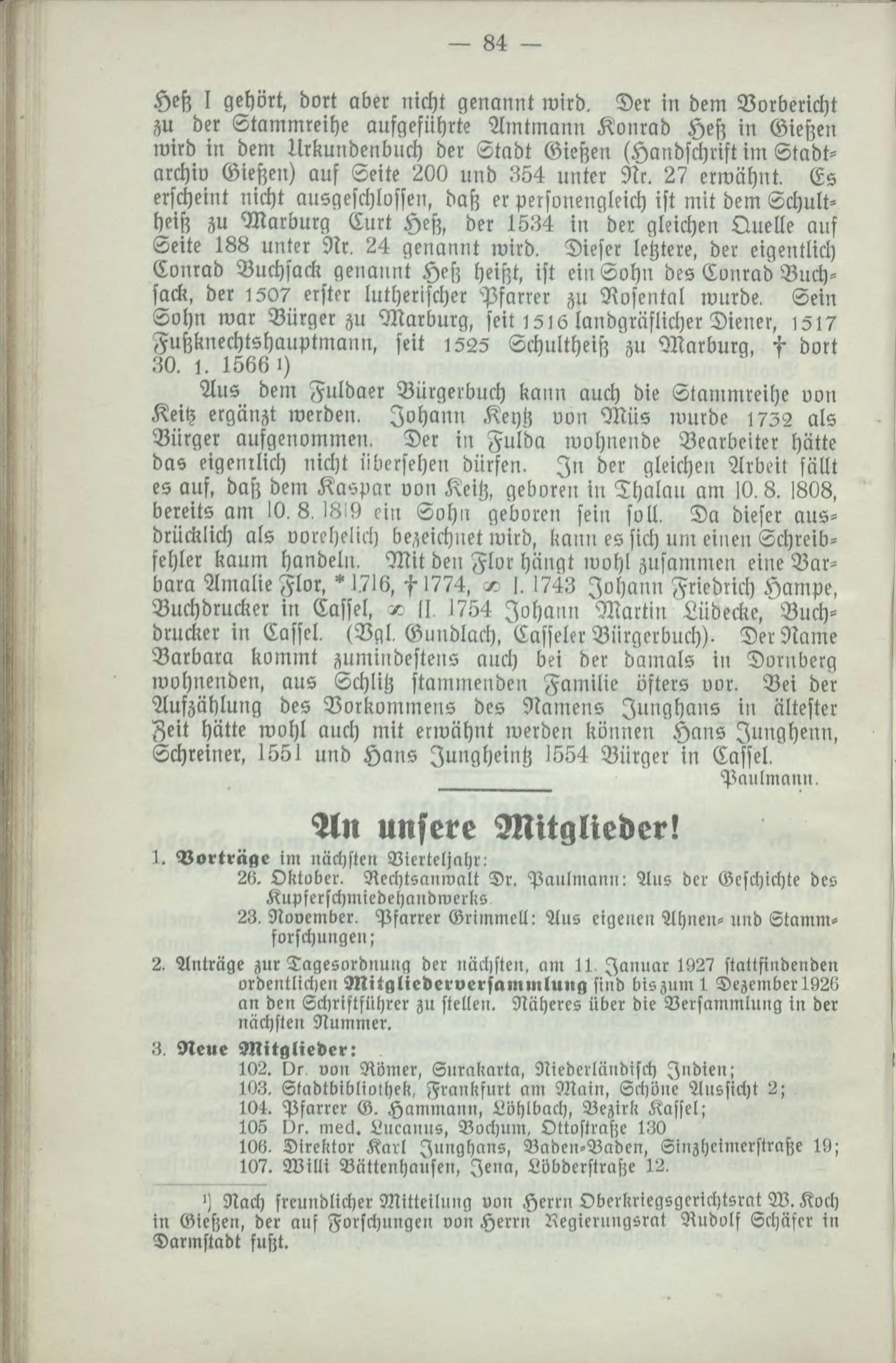 Heß I gehört, dort aber nicht genannt wird. Der in dem Vorbericht zu der Stammreihe aufgeführte Amtmann Konrad Heß in Gießen wird in dem UrKundenbuch der Stadt Gießen (Handschrift im Stadt¬archiv Gießen) auf Seite 200 und 354 unter Nr. 27 erwähnt. Es erscheint nicht ausgeschlossen, daß er personengleich ist mit dem Schult¬heiß zu Warburg Curt Heß, der 1534 in der gleichen Quelle auf Seite 188 unter Nr, 24 genannt wird. Dieser letztere, der eigentlich Conrad Buchsack genannt Heß heißt, ist ein Sohn des Conrad Buch» sack, der 150? erster lutherischer Pfarrer zu Nosental wurde, Sein Sohn war Bürger zu Marburg, seit 1Z, 6 landgräflicher Diener, !5>7 Futzknechtshauptmann, seit 1Z2S Schultheiß zu Marburg, f dort 30. 1. 1566') Aus dem Fuldaer Vürgerbuch kann auch die Stamnneihe uon Keitz ergänzt werden, Johann Key!; uun Müs wurde 1732 als Bürger aufgenommen. Der in Fulda wohnende Bearbeiter hätte das eigentlich nicht übersehen dürfen. In der gleichen Arbeit fällt es auf, daß dem Kaspar von Keitz, geboren in Thalau am 10, 8. 1808, bereits am !0, 8, W9 cin Sohn geboren sein soll, Da dieser aus-drücklich als vorehelich bezeichnet wird, kann es sich um einen Schreib¬fehler kaum handeln. Mit den Flor hängt wohl zusammen eine Bar¬bara Amalie Flor. "1,716, f 1774. - I. 1743 Johann Friedrich Hampe. Buchdrucker in Lasset. - ll 1754 Johann Martin Lüdecke, Buch¬drucker in Cafsel. (Vgl, Gnndlach, Casseler Vürgerbuch). Der Name Barbara kommt zumindestens auch bei der damals in Dornberg wohnenden, aus Schlitz stammenden Familie öfters nur. Bei der Aufzählung des Vorkommens des Namens Iunghans in ältester Zeit hätte wohl auch mit erwähnt werden können Hans Iunghenn, Schreiner, 155l und Hans Iungheintz 1554 Bürger in Cassel. Paulmann, An unsere Mitglieder! 1. Vorträge im nächsten Vierteljahr! 2«. Oktober. Rechtsanwalt Dr. Paulmann: Aus der Geschichte des Kupferschmiedehandwel'llL 23, Nooember, Pfarrer Vrimmell: Aus eigenen Ahnen- und Stamm« forschungen; 2, Anträge zur Tagesordnung der nächsten, am 11 Januar 1927 stattfindenden ordentlichen Mitgliederversammlung find bis zum 1 Dezember 192<> an den Schriftführer zu stellen. Näheres über die Versammlung in der nächsten Nummer. 3 Neue Mitglieder: 102. Di- von Römer, Enrakarta, Niederländisch Indien; 103. Ltadtbibliolhck, Frankfurt am Main, Schöne Aussicht 2; 104. Pfarrer G. Hammann, Lühlbach, Bezirk Kassel; 105 Us, mecl. Lucanns, Bochum, Ottostraßc 130 106, Direktor Karl Iunghnns, Vaken-Vadcn, Sinzheimerstraße 19; 107. Willi Vättenhansen, Jena, Lübderstrahe 12, >! Nach freundlicher Mitteilung von Herr» Oberkriegsgerichtsrat W. Koch in Gieszen, der auf Forschungen uon Herrn Regierungsrat Nudulf Schäfer in Daimstadt fuszt.