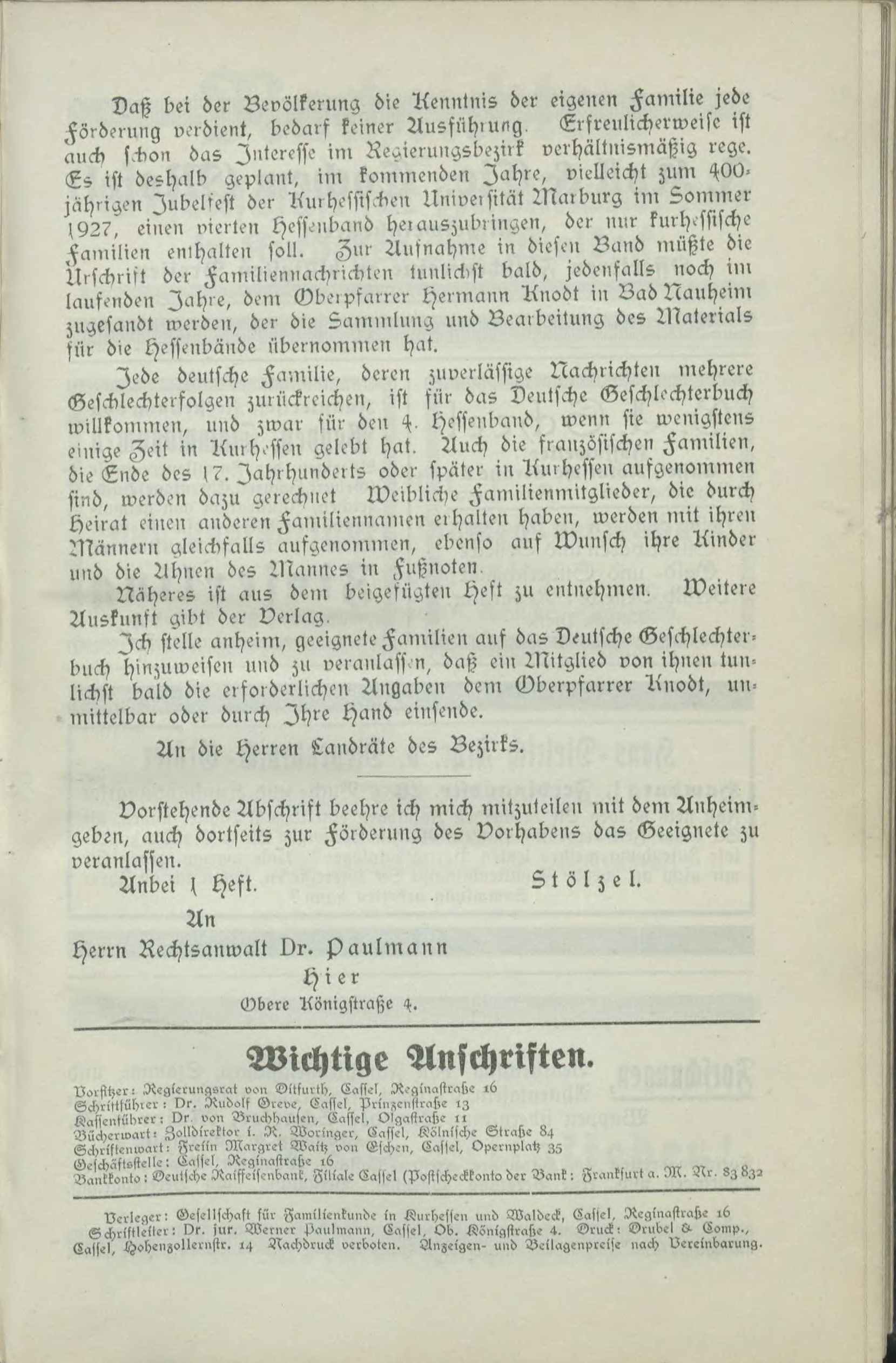 Daß bei der Vevölkerung die Aennlnis der eigenen Familie jede Förderung verdient, bedarf feiner Ausfühiung Erfreulicherweise ist auch schon das Interesse im Regierungsbezirk verhältnismäßig rege. Es ist deshalb geplant, i,n kommenden Jahre, vielleicht zum H00-jahiigen Jubelfest der Aui hessischen Nniveisität Marburg im 5ommer ^927, einen vierten hess/nband hei auszubringen, der nur kurh<ssische Familien enlhalten soll. Zur Ausnahme in diesen Vand müßte die Urschrift der Familiennachrichlen tunlichst bald, jedenfalls noch im laufenden Iah,e, dem Vbeivfaner heonann Anodt in Lad Nauheim zugesandt werden, der die Zammlung und Veaibeilung des Materials für die hesseubände iibernommen hat. Jede deutsche Familie, deren zuverlässige Nachrichten mehrere Geschlechterfolgen zurückreichen, ist fiir das Deutsche Geschlechterbuch willkommen, und zwar fiir den ^ hessenband, wenn sie wenigstens einige Zeit in Ru>h>ssen gelebt hat. Auch die französischen Familien, die Ende des <?. Jahrhunderts oder später in Arn Hessen aufgenommen sind, werden dazu gerechnet weibliche Familienmitglieder, die durch Heirat einen anderen Familiennamen erhalten haben, werden mit ihren Männern gleichfalls aufgenommen, ebenso auf Wunsch ihre Rinder und die Ahnen des Mannes in Fußnoten, Näheres ist aus dem beigefügten Heft zu entnehmen, weitere Auskunft gibt der Verlag, Ich stelle anHeim, geeignete Familien auf das Deutsche Geschlechter-buch hinzuweisen und zu ueranlass n, daß ein Mitglied von ihnen tun¬lichst bald die erforderlichen Angaben dem Oberpfarrer 'lxnodt, un¬mittelbar oder durch Ihre Hand einsende. An die Herren Candräte des Vezirks. vorstehende Abschrift beehre ich mich mitzuteilen mit dem Anheim-geben, auch dortseits zur Förderung des Vorhabens das Geeignete zu veranlassen. Anbei 1. Heft. 5 t ö I z e I. An Herrn Rechtsanwalt Dr. paulmann hier Vbe« Uönigstratze q. Wichtige Anschriften. Vorsitzer- ,Neg<erun»örai «.„> Gil!,nN>, lFalk!, R^iinasti.il« lü Gchri,!Iü!,>e>,' : Di', Rudolf Grcve, Lasse!, pri,>zc„«roke ,Z Oasjcnttülier - vr i'o» Vruc!>I>,u!?n, Cassel, VIgastras« >l Vllchülwar!: Zoüdiretlor i, R, W°rü>l,cr, Lasse!, O«!nl!che Llrahe 84 Gchllkait! ssrclin Maigret Wach vo,> E<chc„, Castel, 0per„pl<ch I5 !le: Dassel «efi„ass«b ü „ , !" p , c!!> Ge!chäft°stl ss, f,ss«b lü Bankkon!« : G«,>!che Raiffcilcnbant, Filiale Eajle! <post!chec«a»»° der Vant ^ Fianklurl a, M, N» 5Z 8^,2 Vcrleaer- GeseNIchas» !ilr ssami>ie,>k>,nl>i m «iichesic,, unt> Wald,eck, Ealje!, Reginastrage it> Gchilftleüer^ 0r, ,ur, U!er„er ftaulmann, Eassel. 0b, Köniasirnw 4, Druck! Grube! «^ Eomp,, Ea!I«>, H«he„zoUei»str, 14 Nachdruck oeibolen, Anzeigen- und Bcttagenprci!« »ach Ueiimbarung,