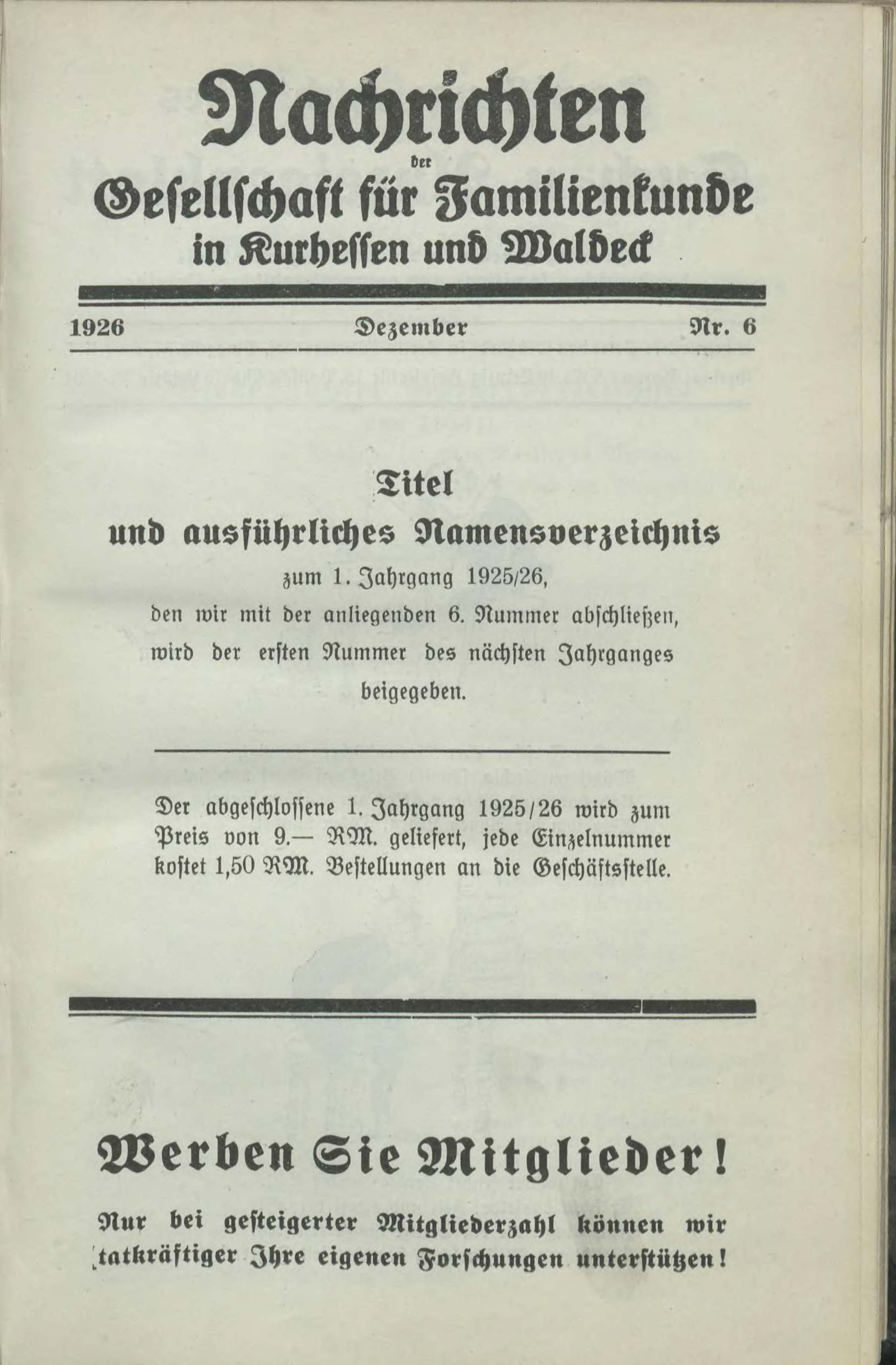 Nachrichten Gesellschaft für Familientunbe in Kurhessen und Waldeck 1926 Dezember Nr. 6 Titel und ausführliches Namensverzeichnis zum 1. Jahrgang 1925/26. den wir mit der anliegenden 6. Nummer abschließen, wnd der eisten Nummer des nächsten Jahrganges beigegeben. Del abgeschlossene 1, Jahrgang 1925/26 wird zum Pleis von 9.— RM. geliefert, jede Einzelnummer kostet 1,50 RM. Bestellungen an die Geschäftsstelle.