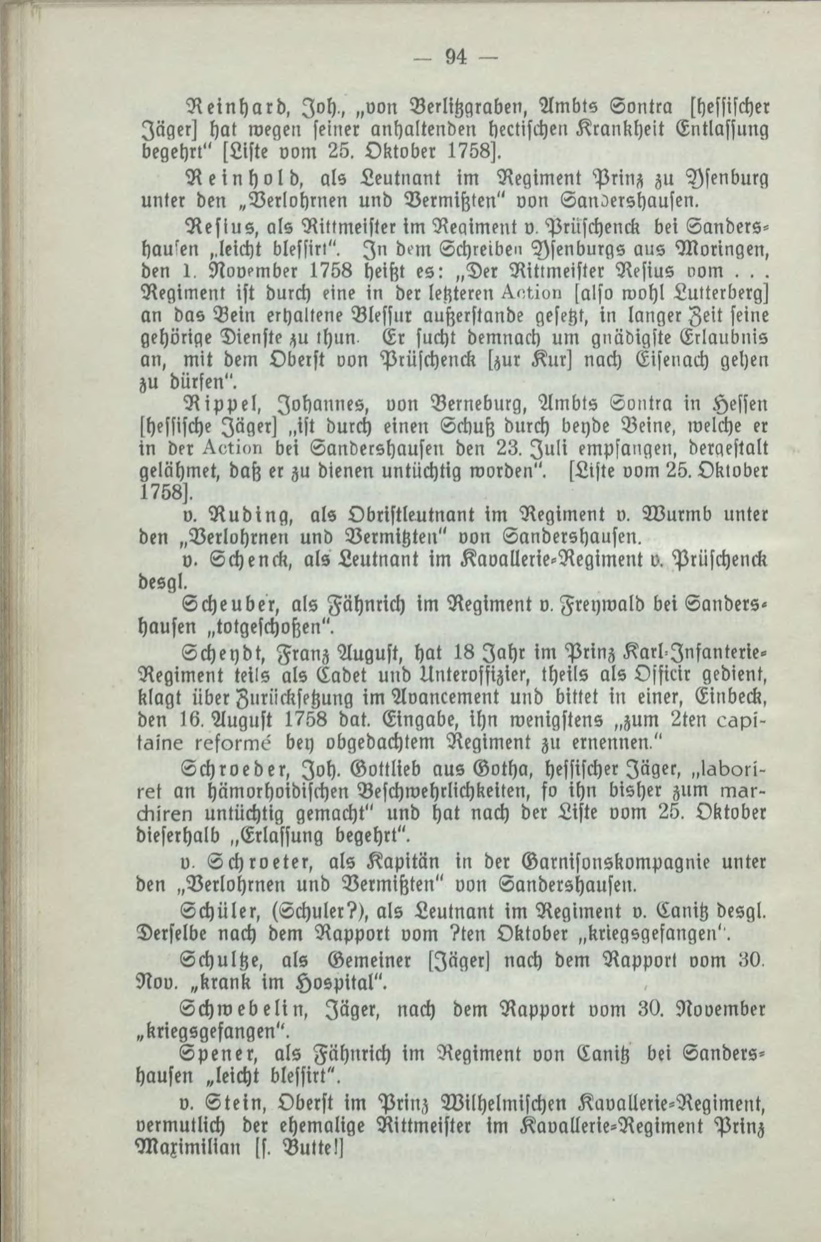 Reinhard, Ioh,, „von Verlitzgiaben, Ambts Sontra shesfischer Jäger) hat wegen seiner anhaltenden hectischen Krankheit Entlassung begehrt" sListe vom 25, Oktober 17581. Nein hold, als Leutnant im Regiment Prinz zu Vsenburg unter den „Verlohnten und Vermißten" von San^ershausen. Resius, als Rillmeister im Reaiment v, Prüschenck bei Sanders« hauten ,,Ieicht blessirl". In dem Schreibe" Vsenburgs ^^s Moringen, den 1, November 1758 heißt es: „Der Rittmeister Nesius nom . , . Regiment ist durch eine in der letzteren ^<!tiu» salso wohl Lutterberg) an das Bein erhaltene Vlessui außerstande gesetzt, in langer Zeit seine gehörige Dienste zu lhun Er sucht demnach um gnädigste Erlaubnis an, mit dem Oberst uon Pillschenck szur Kur) nach Eisenach gehen zu dürfen". Rippel, Johannes, uon Verneburg, Ambts Sontra in Hessen Hessische Jäger) „ist durch einen Schuß durch bende Veine, welche er in der ^Oticm bei Sandershausen den 23, Juli empfangen, dergestalt gelähmet, daß er zu dienen untüchtig worden". sListe vom 25. Oktober 1758). o. Ruding, als Obristleutnant im Regiment o. Wurmb unter den „Verluhrnen und Vermißten" von Sandeishausen. v. Schenck, als Leutnant im Kaoallelie-Regiment o. Prüschenck desgl. Scheuber, als Fähnrich im Regiment u, Freywald bei Sanders« Hausen „totgeschoßen". Schei)dt, Franz August, hat 18 Jahr im Prinz Karl-Infanterie« Regiment teils als Cadet und Unteroffizier, »Heils als Osfkir gedient, klagt über Zurücksetzung im Auancement und bittet in einer, Einbeck, den 16, August 1758 dat, Eingabe, ihn wenigstens „zum 2ten capi-tame refoi-m^ bei) obgedachtem Regiment zu ernennen," Schroeder, Ioh. Gottlieb aus Gotha, hessischer Jäger, „labori-ret an hämorhoidischen Veschwehrlichkeiten, so ihn bisher zum mar-ctiiren untüchtig gemacht" und hat nach der Liste vom 25, Oktober dieserhalb „Erlassung begehrt". u, Schroeter, als Kapitän in der Garnisonskompagnie unter den „Verlohrnen und Vermißten" uon Sandershausen. Schüler, (Schüler?), als Leutnant im Regiment o. Canitz desgl. Derselbe nach dem Rapport vom ?ten Oktober „kriegsgefangen', Schultze, als Gemeiner sIägerj nach dem Rapport vom 30, Nou. „krank im Hospital". Schwebelin, Jäger, nach dem Rapport uom 3(1. Nouember „kriegsgefangen". Spener, als Fähnrich im Regiment uon Canitz bei Sanders« Hausen „leicht blessirt". v. Stein, Oberst im Prinz Wilhelmischen Kauallerie-Regiment, uermutlich der ehemalige Rittmeister im Kauallerie-Regiment Prinz Mazimilian Is, Butte!>
