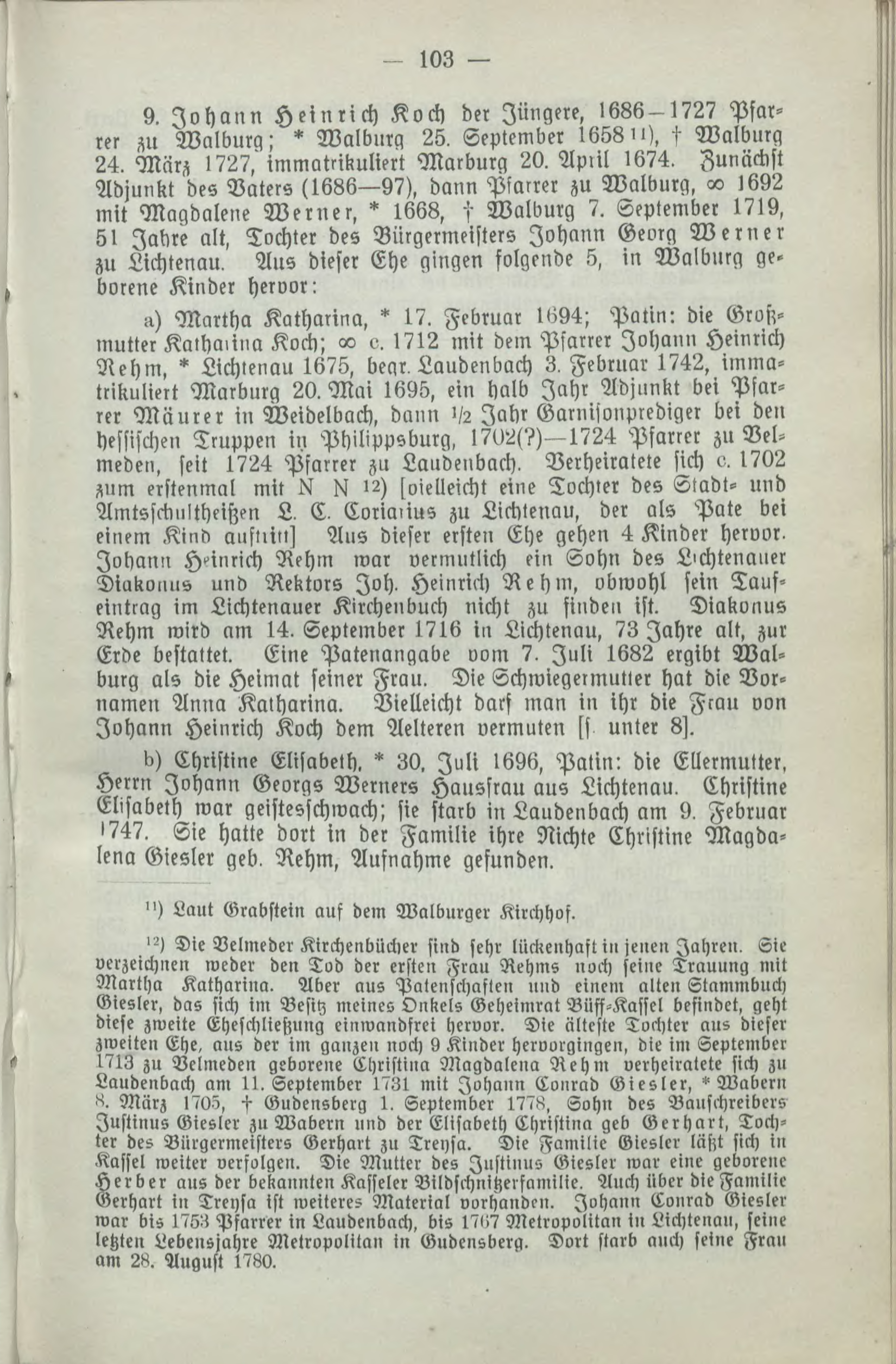 9. Johann Heinrich Koch der Jüngere. 1686-172? Pfar-rer zu Walburg; * Wallung 25, Seplemder 1658"), f Wallung 24. März !727. immatrikuliert Marburg 20. Apnl 1674. Zunächst Adjunkt des Vaters (1686—97), dann Planer zu Walburg, °° 1692 mit Maadalene Werner. * 1668, f Waluurg 7. September 1719, 5! Jahre alt, Tochter des Bürgermeisters Johann Georg Werner zu Lichtenau. Aus dieser Ehe gingen folgende 5, in Waldurg ge> borene Kinder hervor: u) Martha Katharina, * 17. Februar 1694; Patin: die Gruk-mutter Katharina Koch; n o. 1712 mit dem Pfarrer Johann Heinrich Nehm, * Lichienau 1675, bec,r, Laudenbach 3, Februar 1742, imma¬trikuliert Marburg 20. Mai 1695, ein halb Inhr Adjunkt bei Pfar¬rer Maurer in Weidelbach, dann >/2 Jahr Garnisonprediger bei den hessischen Truppen in Philippsburg, 170^?)—1724 Pfarrer zu Vel-meden. seit 1724 Pfarrer zu Laudenbach. Verheiratete sich c. 1702 z»m erstenmal mit ^ dl '2) vielleicht eine Tochler des Sladt- und Amtsschultheißen L, C. CorianuZ zu Lichlenau, der als Pate bei einem Kind anfüiü^ Aus dieser eisten Ehe gehen 4 Kinder heruur. Johann Heinrich Nehm war vermutlich ein Sohn des L'chtenauer Diukmms und Nektors Ioh, Heinrich Nehm, obwohl sein Tauf« eintrug im Lichtenauer Kirchenbuch nicht zu finden ist. Diakunus Nehm wird am 14, September 1716 in Lichtenau, 73 Jahre alt, zur Erde bestaltet. Eine Patenangabe uom 7, Juli 1682 ergibt Wal¬burg als die Heimat seiner Frau, Die Schwiegeimutler hat die Vor¬namen Anna Katharina. Vielleicht darf man in ihr die Frau oon Johann Heinrich Koch dem Aelteren vermuten ss unter H. b) Christine Elisabeth. * 30. Juli 1696, Patin: die Ellermutter. Herrn Johann Georgs Werners Hausfrau aus Lichtenau. Christine Elisabeth war geistesschwach; sie starb in Laudenbach am 9, Februar '747. Sie hatte dort in der Familie ihre Nichte Christine Magda¬lena Giesler geb, Nehm, Aufnahme gefunden. ") Laut Grabstein auf dem Walburger Kirchhuf. "! Die Velmedei Kirchenbücher find sehr lückenhaft i» jenen Jahre», Sie verzeichnen weder den Tut» der ersten Frau Rehms noch seine Trauung mit Martha Katharina. Aber au« Patenschaften und einem alten Stammbuch Giesler, das sich im Vesiy meines Onkel« Geheimrat Bilff-Kassel befindet, geht diese zweite Eheschließung einwandfrei hcruur. Die älteste Tochter ans dieser zweite» Ehe, aus der im ganzen noch 9 Kinder Hernurgingen, die im September 1713 zu Vclmeden geborene Christina Magdalena Nehm «erheiratete sich zu Laudenbach am II, September 178l mit Johann Conrad Giesler, * Wabern ". März 1705, -f Gudensberg 1. September 1778, Sohn des Vauschreibers Iustinus Giesler zu Wabern und der Elisabeth Christina geb Gerhart, Toch¬ter des Bürgermeisters Gerhart zu Treiisa. Die Familie Giesler laßt sich in Kassel weiter verfolgen. Die Mutter des Iustiuuz Giesler war eine geborene Herbei aus der bekannten Kasseler Vildschni»;e>familie, Auch über die Familie Gerhart in Treysa ist weitere? Material vorhanden. Johann Eourad Giesler war bis 1753 Pfarrer in Laudenbach, bis 17i>7 Metropolitan in Lichtenau, seine letzten Lebensjahre Metropolitan in Gudensbera. Dort starb auch seine Frau am 2«. August 1780.
