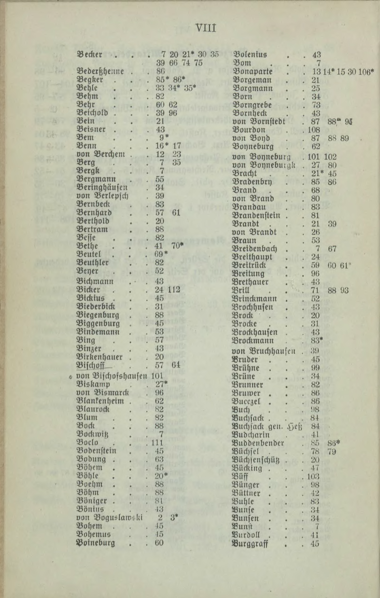 Necker 7 20 21' 30 35 Volenlus . 43 39 66 74 75 Vom . 7 Bedeißheime , 8« Vonaparte . 1314*15 30106' Begker 85' 86» Borgeman . 21 Behle . . , 33 ?4' 35' Vlligmann , 25 Behm 82 Vorn . 34 Behr . . . 60 62 Borngrebe . 73 Beichold . 39 96 Bornheck . 43 Bein 2l von Bornstedt , 87 88" 9« Beisner . 43 Bourdon , 108 Bern 9' von Voyd , 87 8« 89 . Benn 16' 1? Vonneburg , 62 von Berchem , 12 23 uon Vonnebun, , 101 102 Berg 7 33 uon Bonnebmql! , 2? 80 Bergk 7 Bracht , . 21* 45 Bergmann 55 Brüden bey , 85 86 Beringhäuseü 34 Brand . 68 uon Verlepsch 39 uon Brand . 80 Beinbeck 83 Brandau , 83 Bernhard 57 61 Brandenstein , , 81 Berthold . . 20 Brandt . . . 21 39 Bertram 88 non Brandt . , 26 Besse . . . 82 Biaun . 53 Bethe . . . 41 70' Vretdenbach . . 7 67 Beutel . 69' Breithaupt . 24 Beuthler 82 Breitrück . 59 60 61' Beyer 52 Nreitung . 96 Bichmann 43 Nrethauer , 43 Bicker . . , 24 112 Vrill , . , 71 88 03 Bicklus . . . 45 Blinckmann . , 52 Biedcrbick 31 Nrochhnsen . 43 Viegenburg , 88 Brock . 20 Biggenburg , 45 Brocke , , 31 Bindemann . 53 Brockhausen , , 43 Ving 57 Brockmann , 83* Binzer , 43 von Vruchhauscn 39 Birkenhauer , 20 Bruder . , 45 Bischoff , , 57 61 Viilhne . , 99 « uon Vischofshansen ,01 Nrüne . . . 34 Biskamp 27' » Nrunner , 82 uon ViLmaick !>6 Nruwer . , 86 Blanlenheim , 62 Bu«zel . , 8t> Vlaurock «2 Nuch . , , !18 Blum 82 Nuchsack , , 84 Bock 88 Nnchsnck gen, ,^c ii «4 Bockwil! 7 Nudchnlin , >I I Voclo . . , 111 Nuddenbender , «5 8U* Vodenstein 45 Niichscl , , 78 7l) Vodung . 63 Niich>eüschü!, , , 20 Bühem . 45 NUckuia . , 47 Bohle . 20 Vüff , 103 Boehm . 88 Biinaer , 98 Böhm . 88 Niitt„er , 42 Büniger . 8l Buhle , 83 Bönios , ^3 Viinse , 34 unn Vogu?lawill! 3' Vunsen , 34 Bohem 15 Nunft ? Bohcmn« 15 Nüldoll , N Voineburg 60 Burggraff , 45