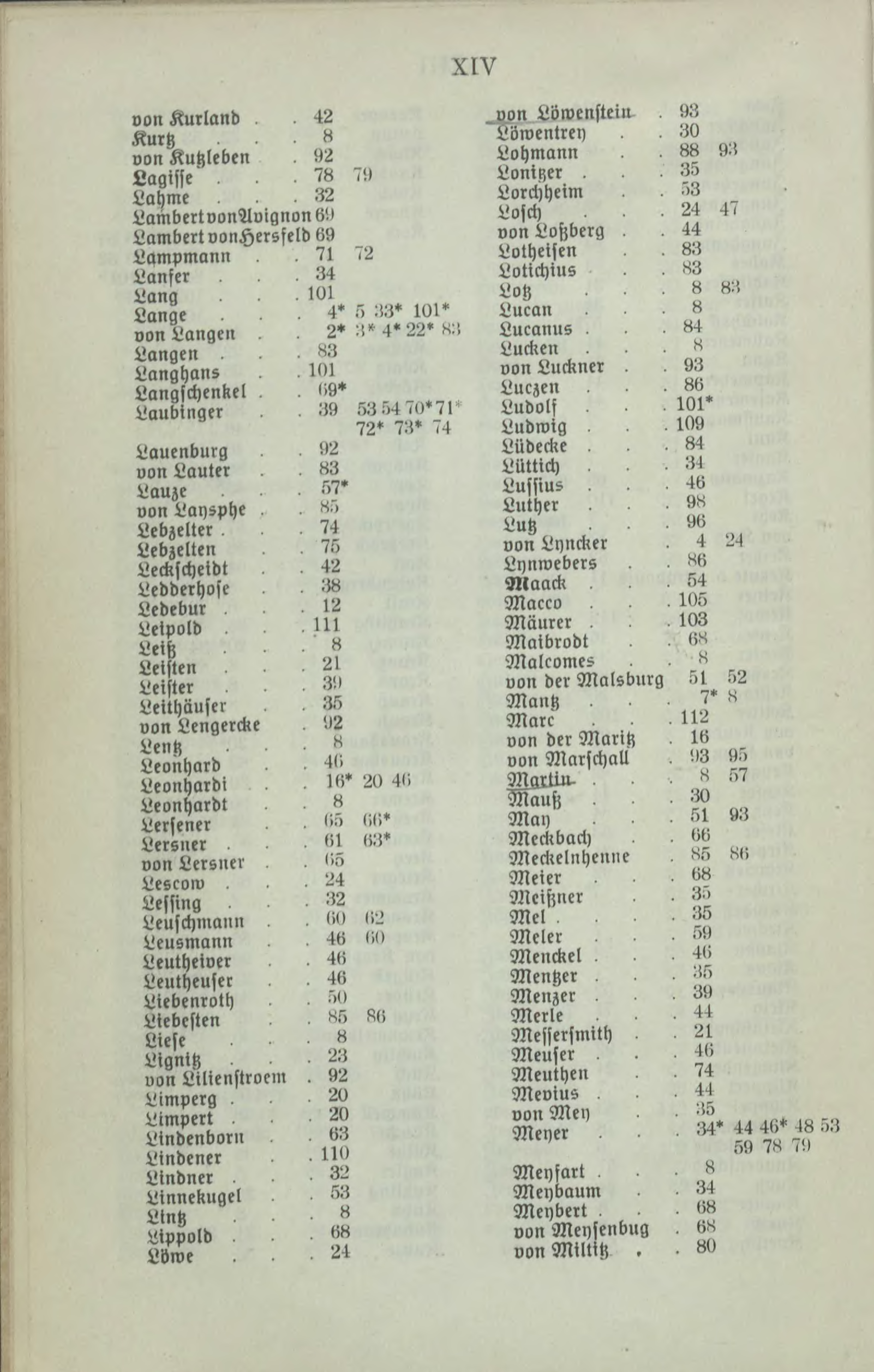 von Kurland , 42 ^Ugn LVwensteill , 93 Kurtz , 8 Läwentrey 30 von Kutzleben , 92 Lohmann 88 9.! Lagisse' , , , 78 79 Lonisser , 35 Lahme , 32 Lorchheim 53 LllmbertnonAu!gnon6!» Losch 24 47 Lambert uonHersfeld 69 von Loßberg , 44 Lllmvmann , 71 72 Lotheisen 83 Lanfer , 34 Lotichius «3 Lang , 101 Lotz , , , 8 85! Lange , 4' 5 -!3* 101* Lucan 8 uon Langen , , 2* !l»4-22" ^l Lucanus , 84 Langen , , «3 Lucken Langhanz , 101 non Luckner , 93 Langschenkel , , li9» Luczen 86 Laubinger , 39 53 54 70*71' Ludolf , 101* 72' 73» 74 Ludwig , IM Lauenburg , 92 Lüdecke , , , 84 uon Lauter , »3 LUttich , , 3^ Lauze , 57' Lussiu5 , , , 46 uon Lansphe , »5 Luther , 9« Lebzelter, , 74 Lutz , , , 96 Lebzelten , 75 uon Lyncker 4 24 Leckscheidt , 42 Lynwebers «6 Ledderhose , 38 sllaack , 54 Lebebur , 12 Macco 105 Leipold , , 111 Maurer , 103 Leiß , 8 Maibrodt 6^ Leisten , , , 21 Malcomes Leister , 3!» uon der Malsburg 51 52 Lcithäuser , 35 Mantz , 7* uon Lengercke , Ü2 Marc 112 Lenl, non der Maritz 16 Leonhard , 46 uon Marschall !>3 95 Leonhardi 16* 20 40 Mgitw. , 57 Leonhardt , 8 Mauß 30 Lersener , 65 <!!!* Mai, 51 93 Lersner , 61 63* Meckbach 66 von Lersner , , l',5 Meckelnhemie «5 «6 Lescow , , 24 Meier , , , 68 Lessing , 32 Meißner 35 Leuschmann , 6« 62 Mel , , , , 35 Leusmann , 46 60 Meler , , , 59 Leutheiner , 46 Menckel 46 Leutheuser , 46 Mentzer , !!5 Liebenroth , 50 Menzer , 39 Liebcsten , «5 86 Merle 44 Liese , , , 8 Messersmith , 21 Lignitz , , , 28 Meuser 46 uon Lilienslroem , 92 Meuthen 74 Limperg , , 20 Meviuz 44 Limpert , , 20 uon Men !!5 Lindenbor» , 63 Meyer 34* 44 46* 48 Lindener , U0 59 78 7!> Lindner , , 32 Meysart , Linnekugel , 53 Menbaum 34 Lintz , 8 Meybert , 68 «ippold , , 68 uon Meysenbug , 6« Löwe . , , 24 von Millitz . 80