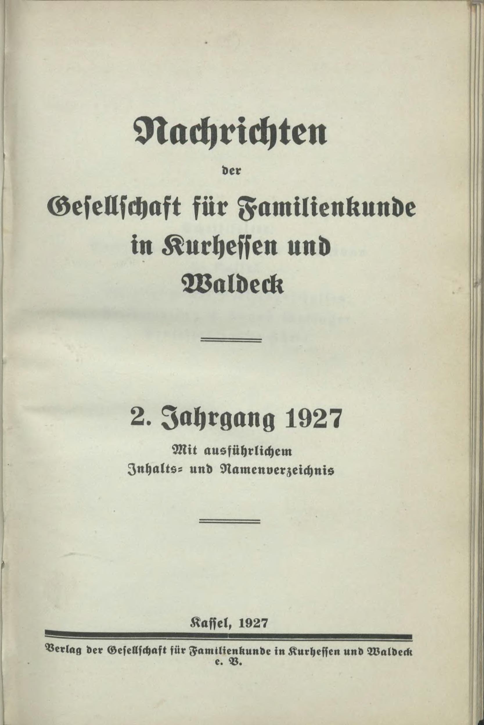 Nachrichten der Gesellschaft für Familienkunde in Kurhessen und Waldeck, 2. Jahrgang, Hefte 1-4 sowie 1 Inhaltsverzeichnis, Verlag der Gesellschaft für Familienkunde in Kurhessen und Waldeck e. V., 1927