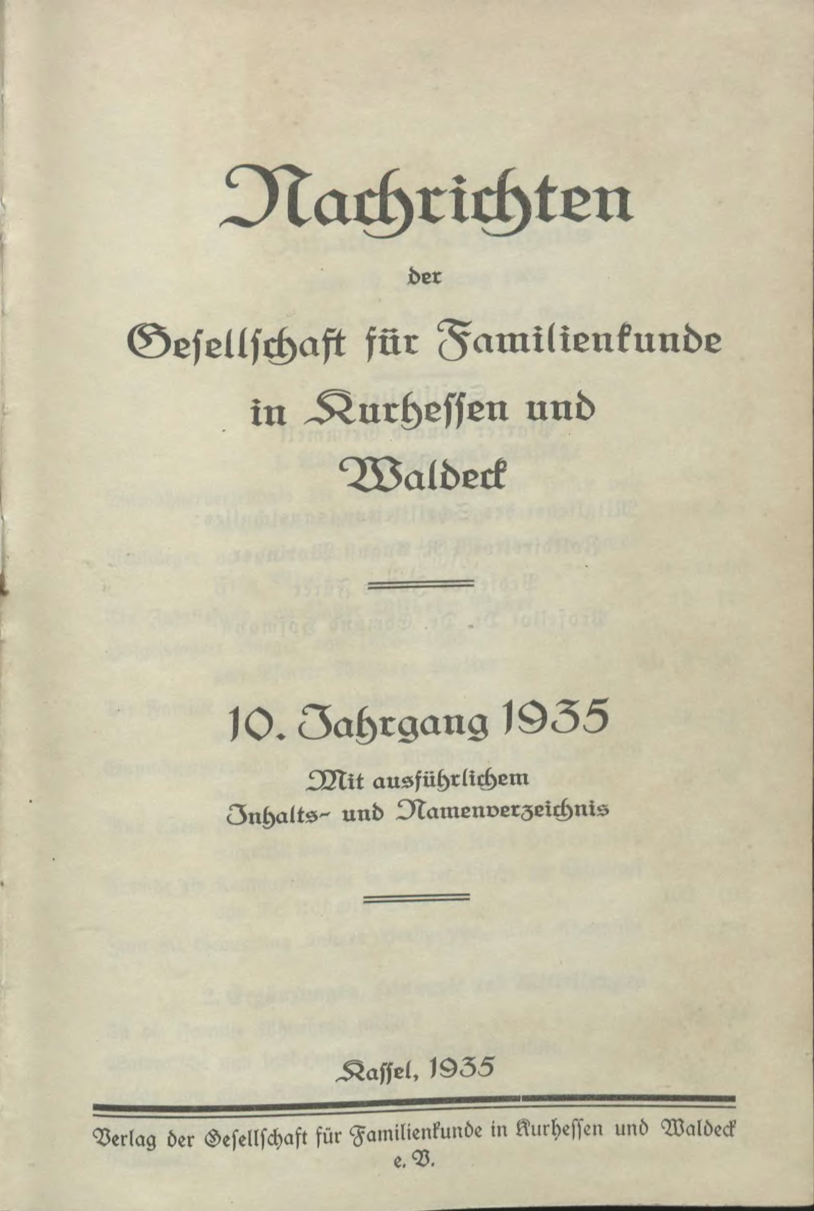 Nachrichten der Gesellschaft für Familienkunde in Kurhessen und Waldeck, 10. Jahrgang, Hefte 1-4 sowie 1 Inhaltsverzeichnis, Verlag der Gesellschaft für Familienkunde in Kurhessen und Waldeck e. V., 1935