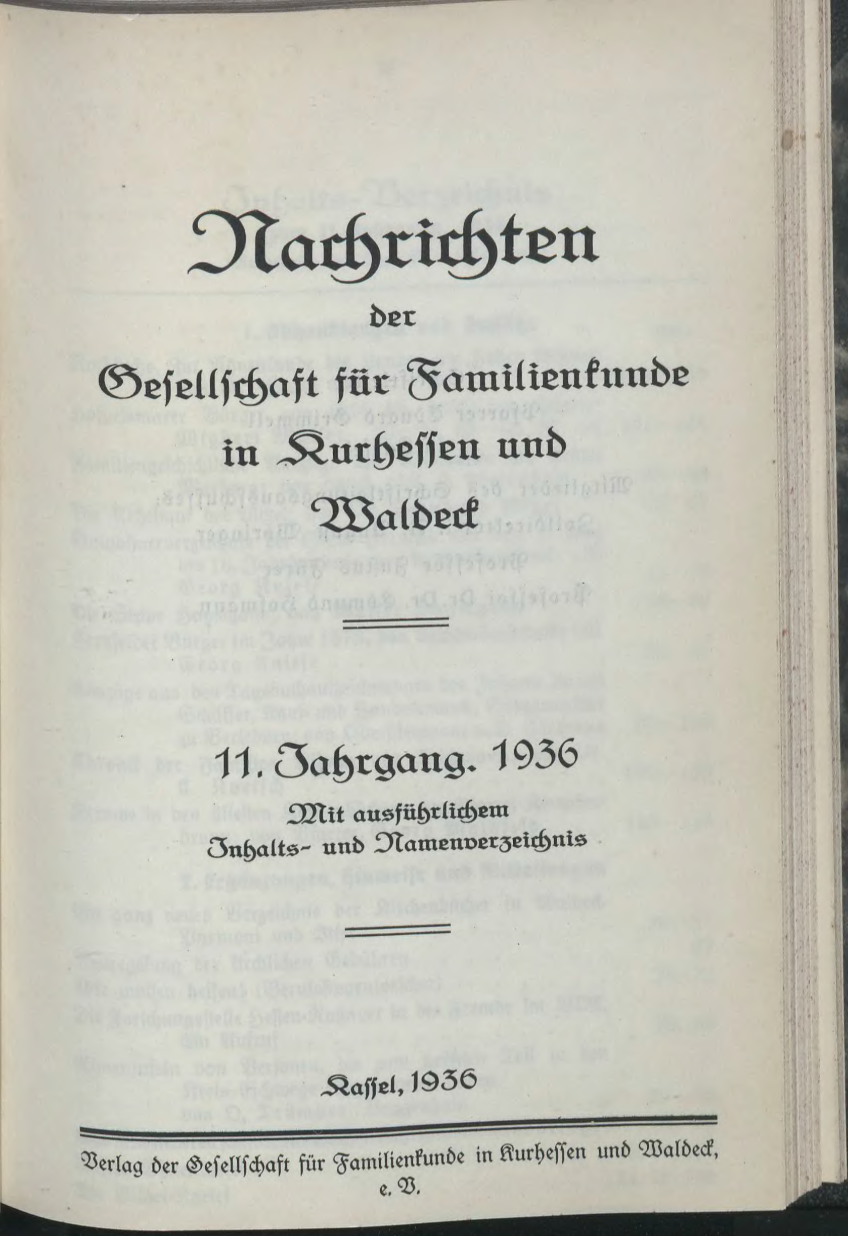 Nachrichten der Gesellschaft für Familienkunde in Kurhessen und Waldeck, 11. Jahrgang, Hefte 1-4 sowie 1 Inhaltsverzeichnis, Verlag der Gesellschaft für Familienkunde in Kurhessen und Waldeck e. V., 1936
