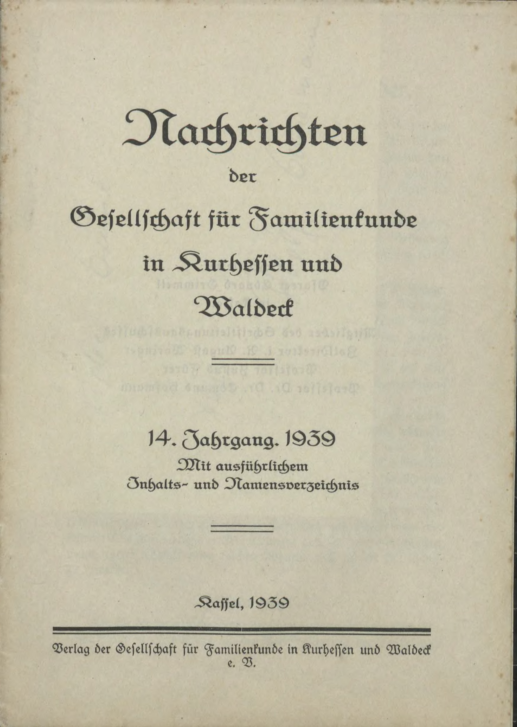 Nachrichten der Gesellschaft für Familienkunde in Kurhessen und Waldeck, 14. Jahrgang, Hefte 1-3 sowie 1 Inhaltsverzeichnis und 2 Sonderbeilagen, Verlag der Gesellschaft für Familienkunde in Kurhessen und Waldeck e. V., 1939