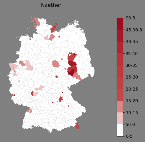 Relative Verteilung des Namens Naether (1996)Direkt zur Karte Die Farbskala zeigt die Anzahl von "Naether" bezogen auf je 1 Million Einträge. |