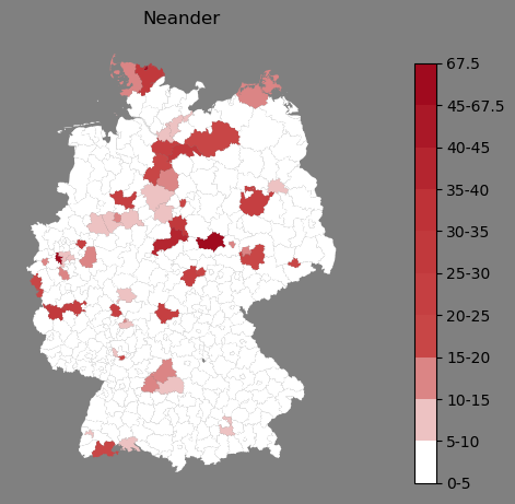 Relative Verteilung des Namens Neander (1996)Direkt zur Karte Die Farbskala zeigt die Anzahl von "Neander" bezogen auf je 1 Million Einträge. |