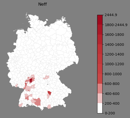 Relative Verteilung des Namens Neff (1996)Direkt zur Karte Die Farbskala zeigt die Anzahl von "Neff" bezogen auf je 1 Million Einträge. |