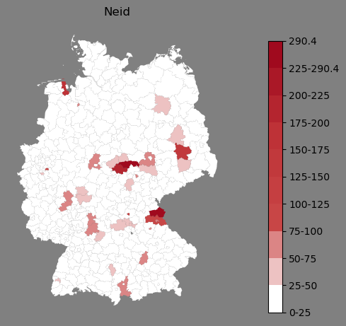 Relative Verteilung des Namens Neid (1996)Direkt zur Karte Die Farbskala zeigt die Anzahl von "Neid" bezogen auf je 1 Million Einträge. |