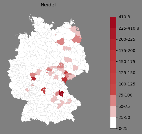 Relative Verteilung des Namens Neidel (1996)Direkt zur Karte Die Farbskala zeigt die Anzahl von "Neidel" bezogen auf je 1 Million Einträge. |