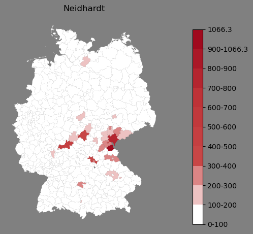 Relative Verteilung des Namens Neidhardt (1996)Direkt zur Karte Die Farbskala zeigt die Anzahl von "Neidhardt" bezogen auf je 1 Million Einträge. |