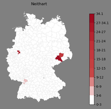 Relative Verteilung des Namens Neithart (1996)Direkt zur Karte Die Farbskala zeigt die Anzahl von "Neithart" bezogen auf je 1 Million Einträge. |