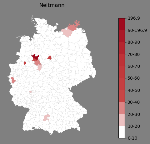 Relative Verteilung des Namens Neitmann (1996)Direkt zur Karte Die Farbskala zeigt die Anzahl von "Neitmann" bezogen auf je 1 Million Einträge. |