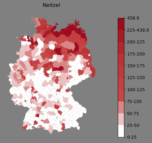 Relative Verteilung des Namens Neitzel (1996)Direkt zur Karte Die Farbskala zeigt die Anzahl von "Neitzel" bezogen auf je 1 Million Einträge. |