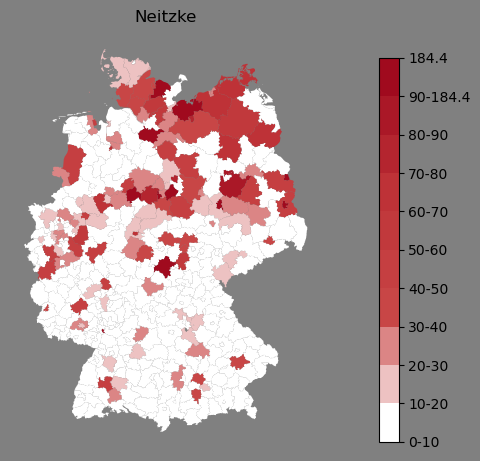 Relative Verteilung des Namens Neitzke (1996)Direkt zur Karte Die Farbskala zeigt die Anzahl von "Neitzke" bezogen auf je 1 Million Einträge. |
