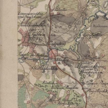 Neu Hermannlöhlen (möglicherweise das Gehöft südwestl. v. Weszeiten) nicht namentlich verzeichnet im Preußischen Urmesstischblatt 1860