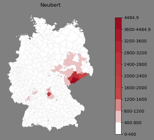 Relative Verteilung des Namens Neubert (1996)Direkt zur Karte Die Farbskala zeigt die Anzahl von "Neubert" bezogen auf je 1 Million Einträge. |